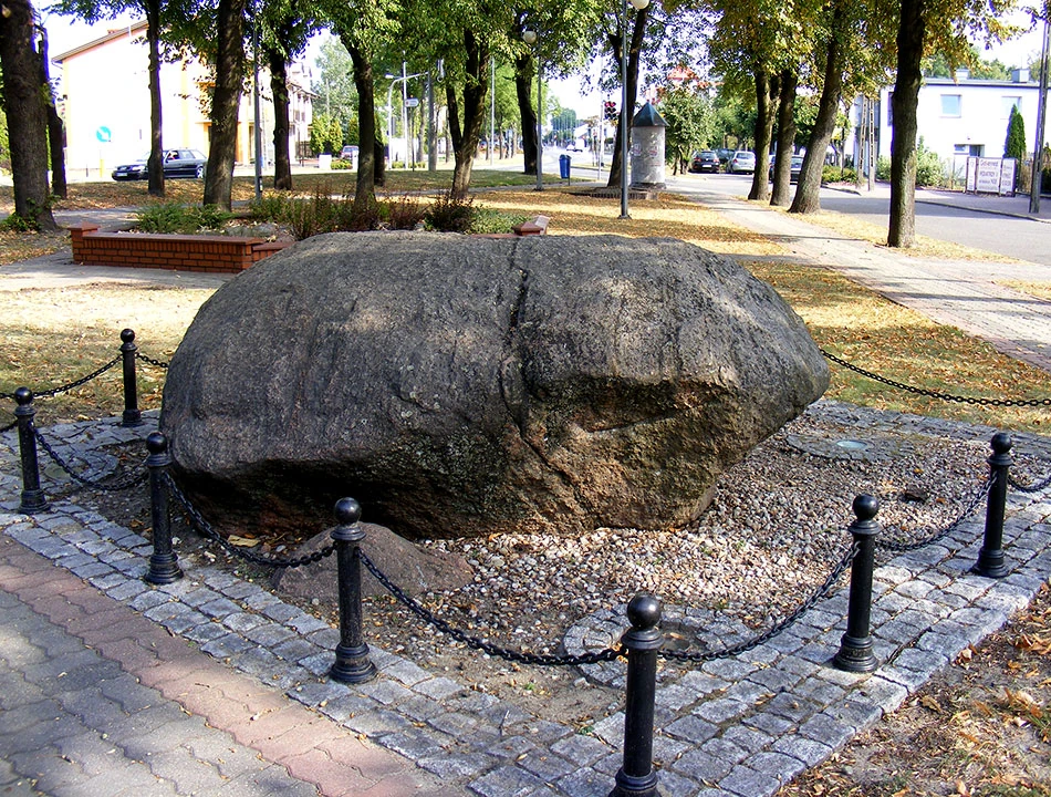 Skręcamy w stronę Serocka. Do tej pory Serock pozostawał dla nas „przelotówką” bez wyrazu, nawet nie przystankiem na drodze dokądś. A tu proszę – już pierwszy napotkany skwer daje wyraz niebanalności okolicy. Mazowsze słynie z pomników o smutnym wyrazie – zwykle są to pamiątki czyichś bohaterskich śmierci. A w Serocku jest pomnik głazu narzutowego. Nawet dom handlowy ma nieoczywistą elewację.