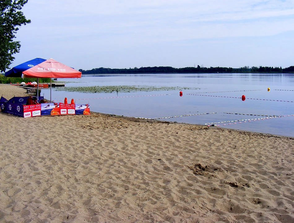 Zjeżdżamy jeszcze niżej — nad samą wodę. A tam, jak obiecywano, plaża, molo i kąpielisko. Są wyznaczone miejsca do pływania, jest stały posterunek WOPR, są zabawki dla dzieci. Żyć nie umierać.