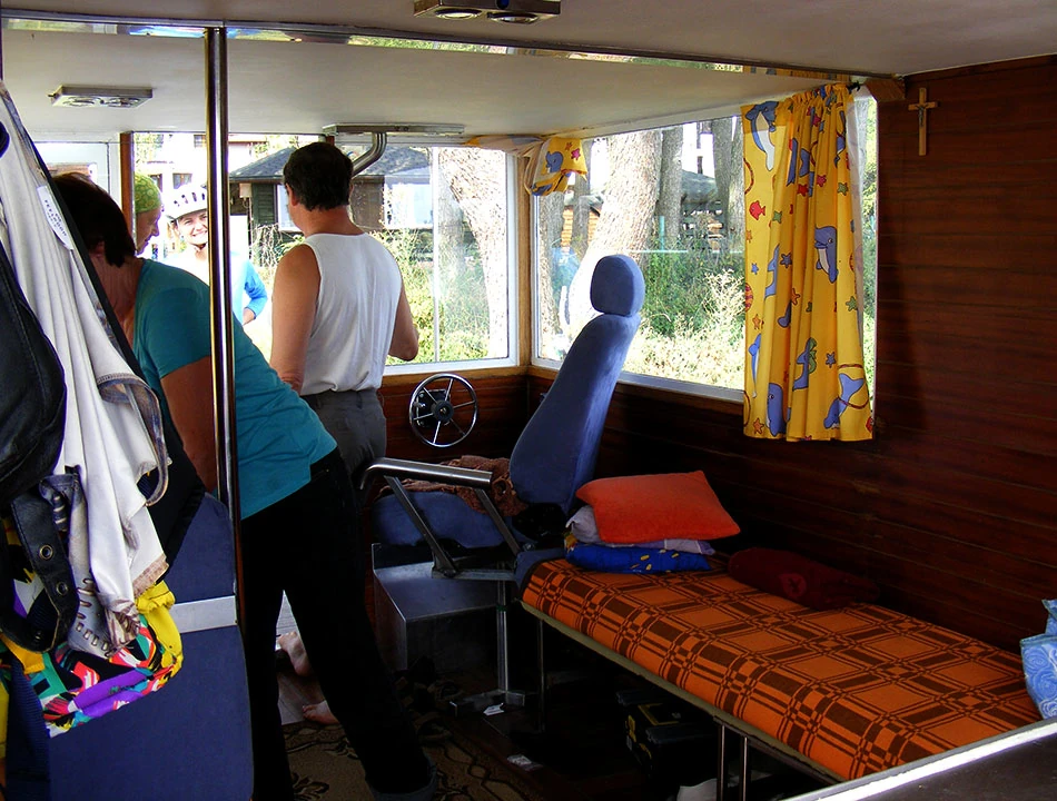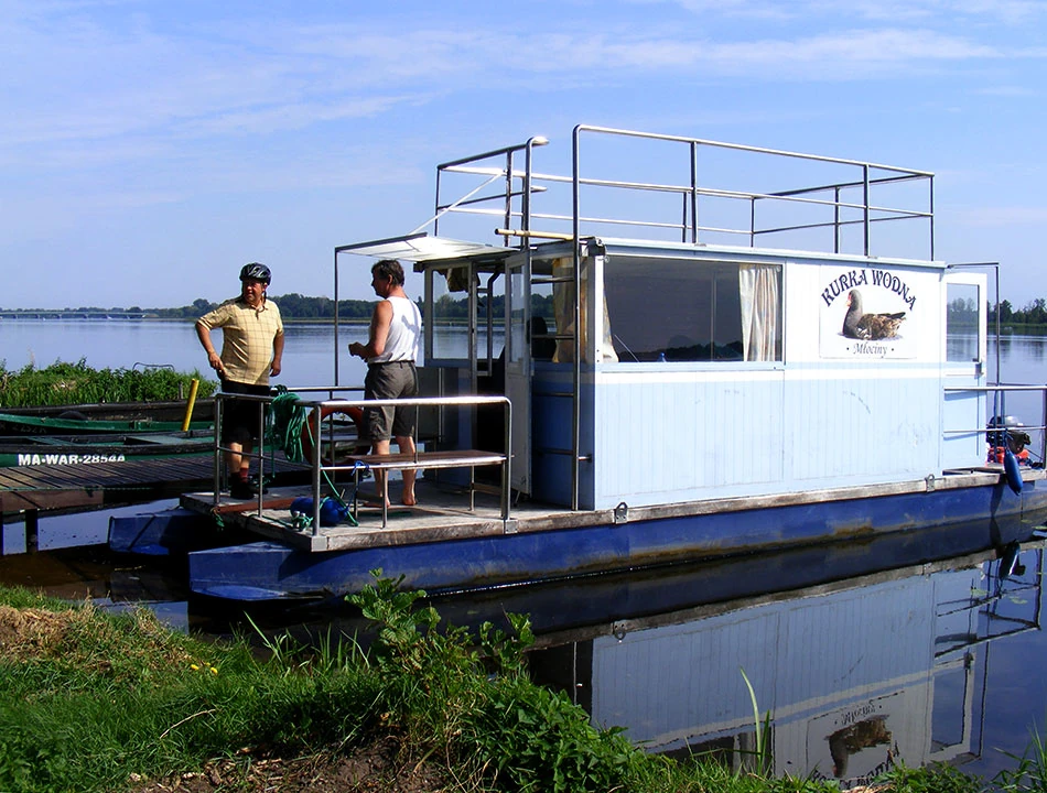 Kurka Wodna to prywatna jednostka pływająca państwa Osińskich z warszawskich Młocin. Pan Jan sam zbudował pływający domek. Wyposażył go w silnik, sypialnię, toaletę i kuchenkę. Wraz z żoną przypłynęli z Warszawy. Kurka Wodna pływała niemal po całej Polsce, Zalewu Wiślanego nie wyłączając. Nawet proponują nam podwózkę na drugą stronę, jednak za dwie godziny. Grzecznie dziękujemy za propozycję i możliwość zwiedzenia domku i ruszamy dalej.