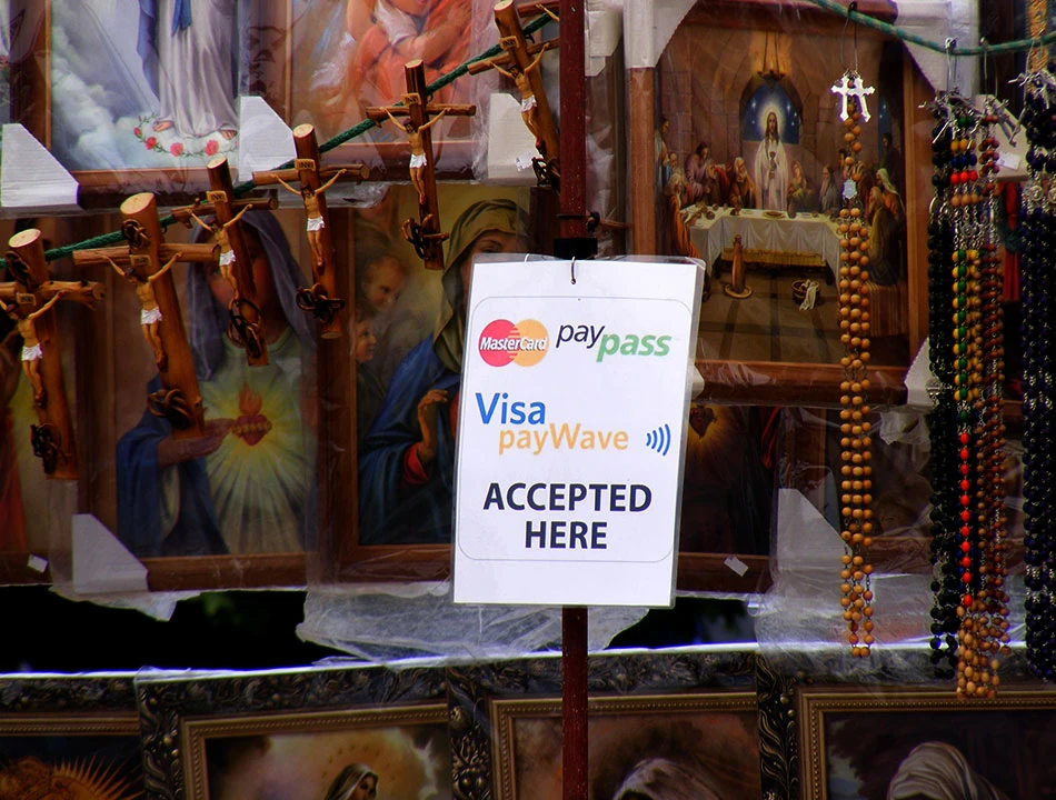 Nowoczesność dotarła i na tego typu jarmarki: za dewocjonalia można płacić kartą.