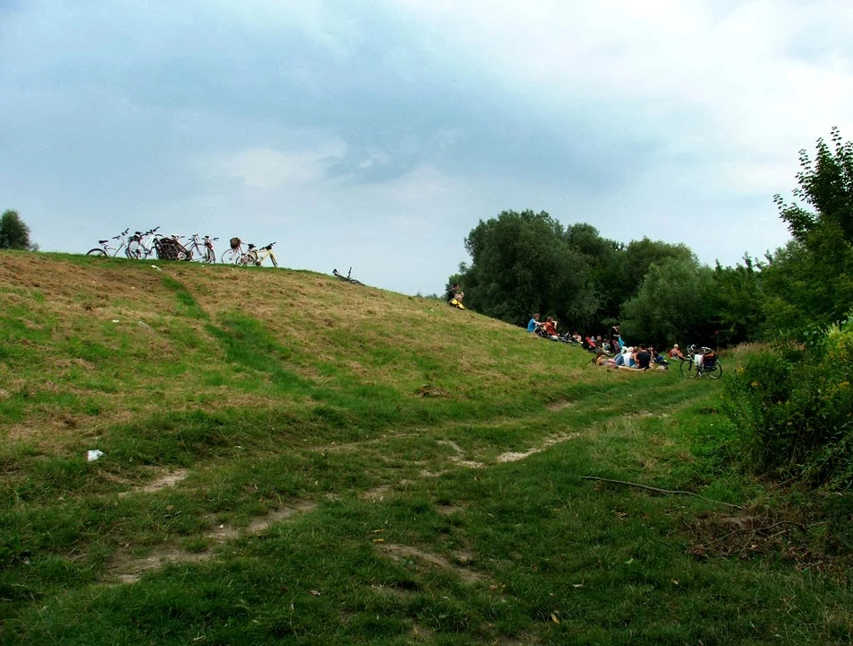 Przejeżdżamy przez Wisłę, która mocno wylała — nie ma śladu po nadbrzeżnych plażach. Spotykamy się przy kościele Bernardynów na Czerniakowskiej. Okazuje się, że jest nas dobrze ponad dwadzieścia osób. Ludzie w bardzo różnym wieku. Także dzieci w przyczepkach i w fotelikach. Tata dziewczynki w foteliku ma dobrze, córka przez całą jazdę drapie go po plecach specjalną drapaczką.