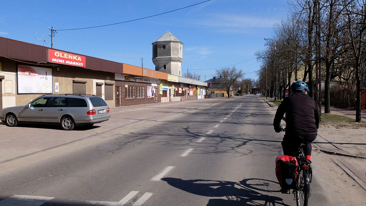 Dalej nie ryzykujemy jazdy poboczem i telepiemy się wydeptaną ścieżyną; dobrze, że nie jest mokro, bo błoto by nas zabiło. I za chwilę wjeżdżamy do Marek.