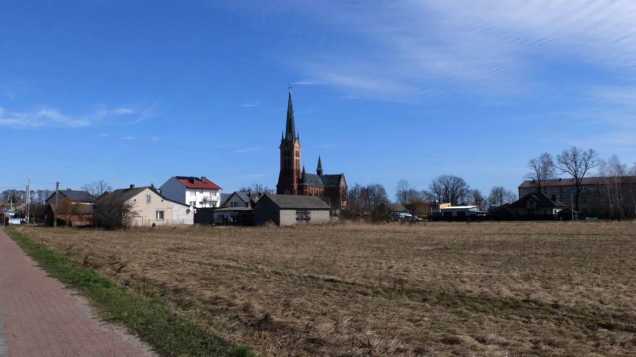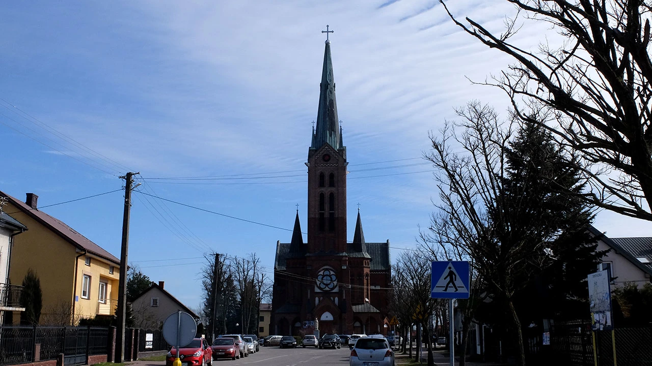 Do Postolisk wjeżdżamy ulicą Stylową. Już z daleka widać ogromny kościół Świętego Stanisława.