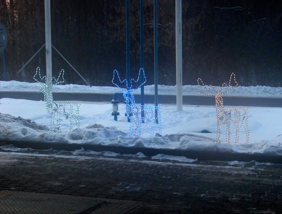 Poddajemy się i szukamy miejsca do ogrzania się. Zatrzymujemy się przy ulicy Szosowej, prowadzącej do stacji Miłosna. Jak zwykle z pomocą przychodzi koncern paliwowy (tym razem niezidentyfikowany). Do odwiedzenia stacji benzynowej zachęcają renifery, uroczo kręcące główkami.