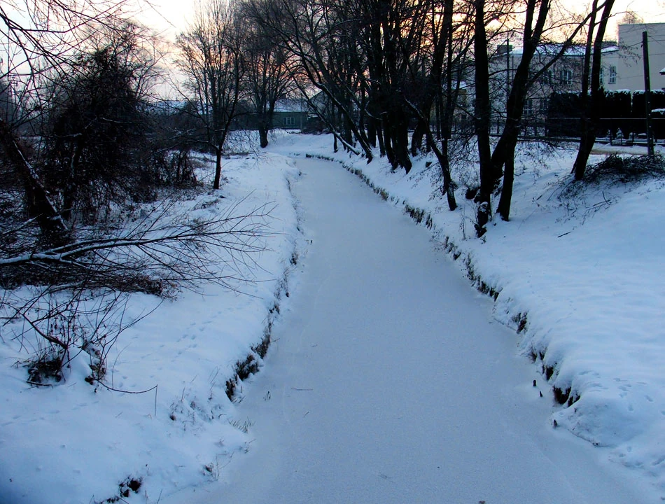 Opuszczamy ciepłe wnętrze i za chwilę wita nas Okuniew. Mijamy strumyk — a może to rzeka Długa — i już jesteśmy w samym centrum.