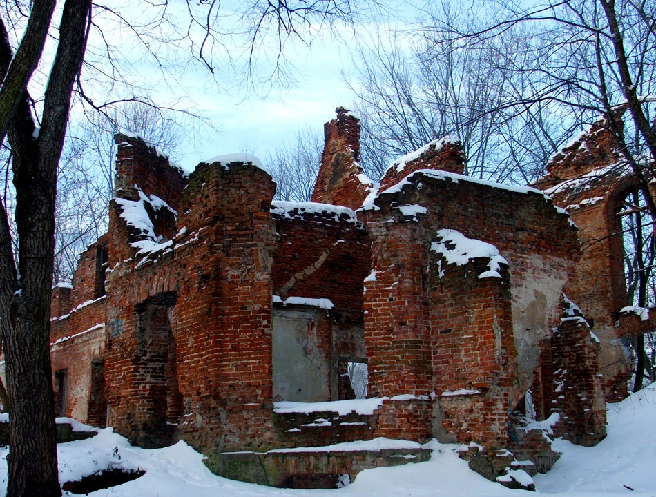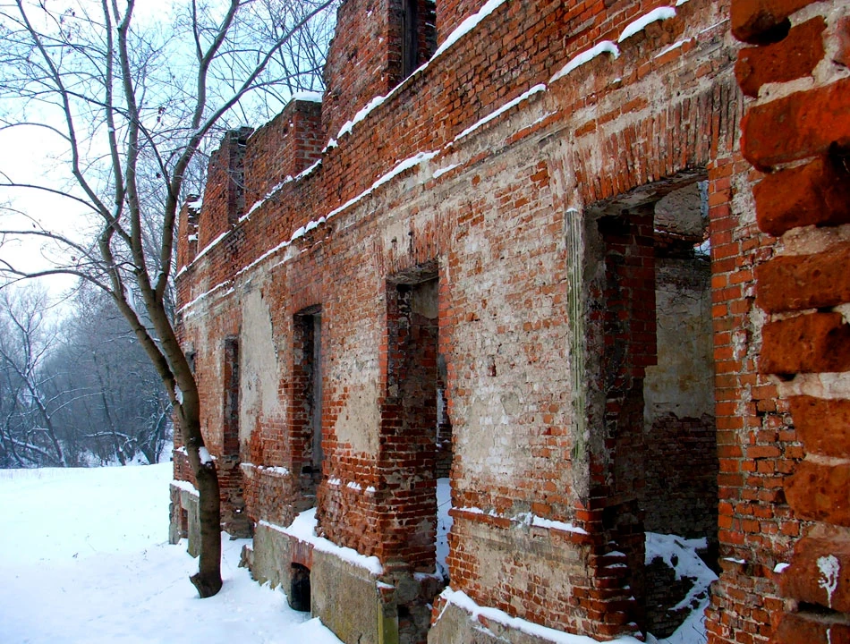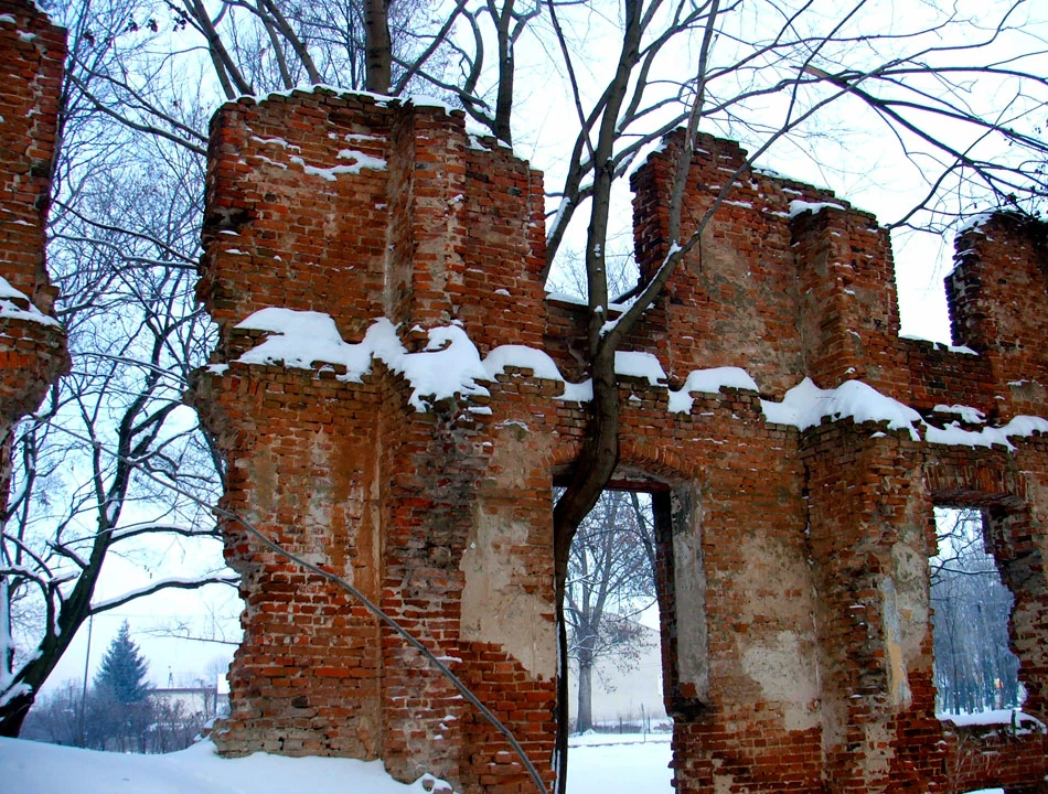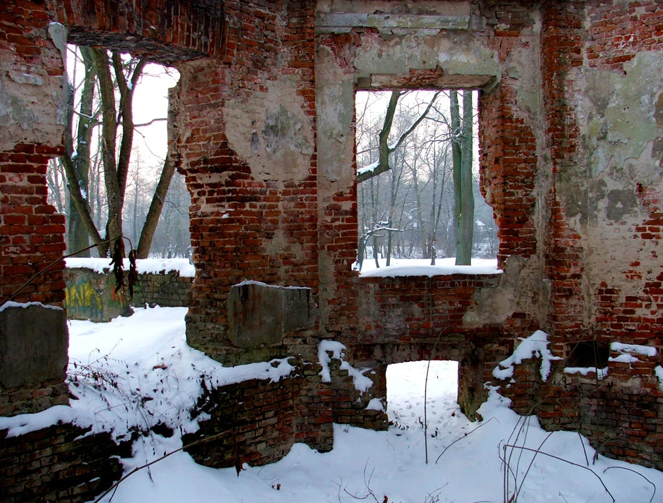 I od razu widać ruiny, które tak chciał zobaczyć Piotrek. Jak się okazuje to ruiny XIX-wiecznego pałacu Łubieńskich. Kiedyś musiała to być potężna dwukondygnacyjna budowla. Chodzimy po ruinach i czujemy się tak, jakbyśmy zaglądali komuś do mieszkania.
