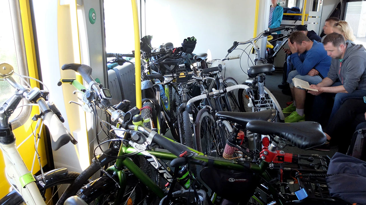 Chętnych do podróżowania z rowerami dużo. Na szczęście jedziemy pociągiem Kolei Mazowieckich; miejsca na bajki więcej niż w Intercity i w dodatku nasze maszyny podróżują bezpłatnie. Są nawet siedzące miejsca, choć chętnych do jazdy, także z rowerami, w trakcie podróży wciąż przybywa.