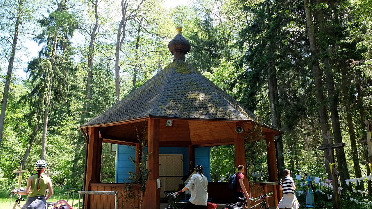 Pojawiają się pierwsze oznakowania Green Velo – na razie nie wiemy na ile będą przydatne. Ulicą 3 Maja wyjeżdżamy z miasta, a Celną wjeżdżamy w las. Jedziemy skrajem Wilczego Jaru i dajemy się skusić drogowskazowi na Świętą Krynoczkę.