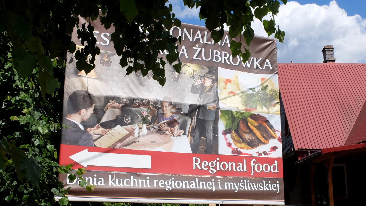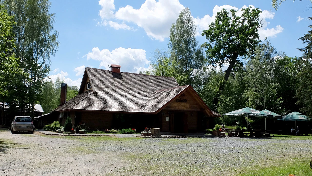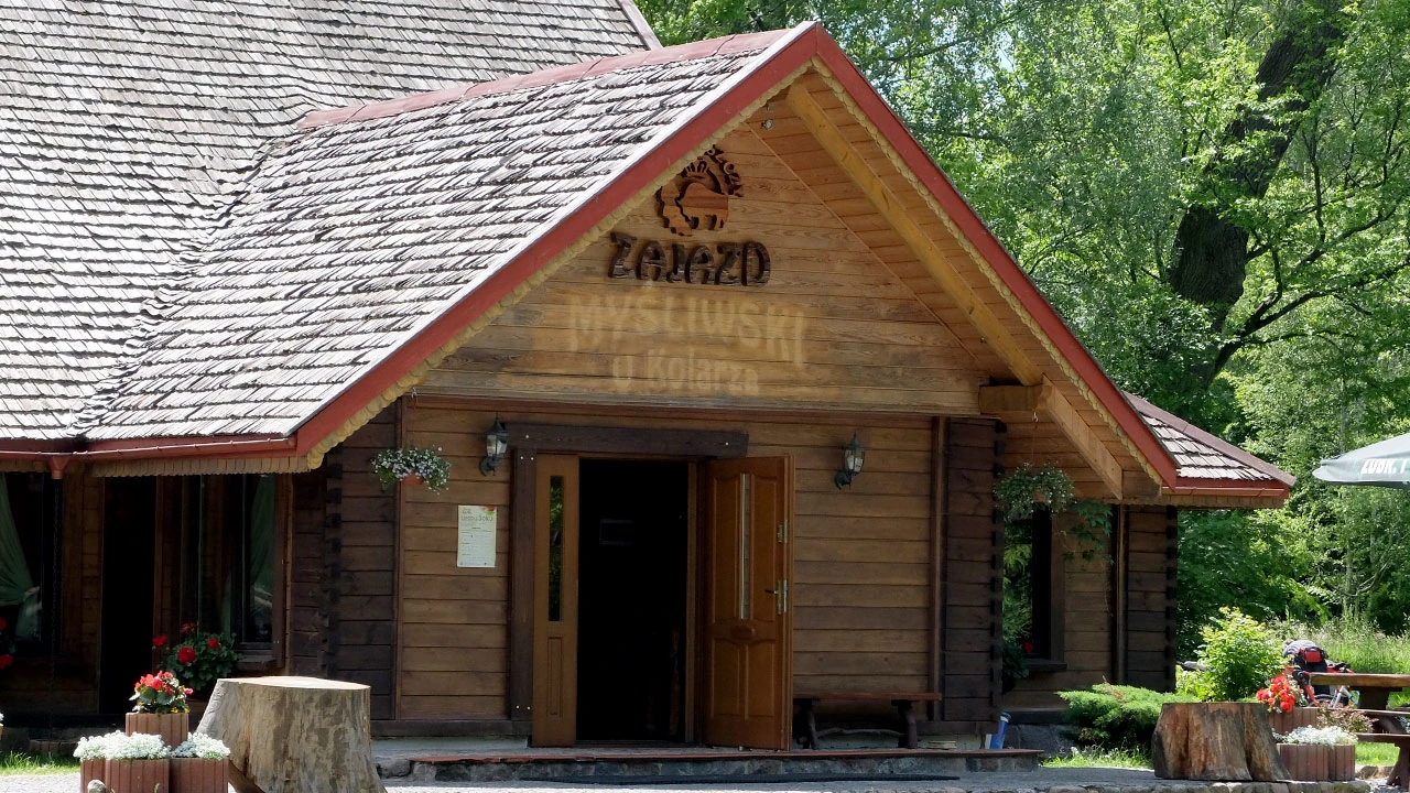 Skręcamy w stronę Bud. A w budach zajazd Myśliwski u kolarza, ale chyba i myśliwi i kolarz gdzieś się oddalili.