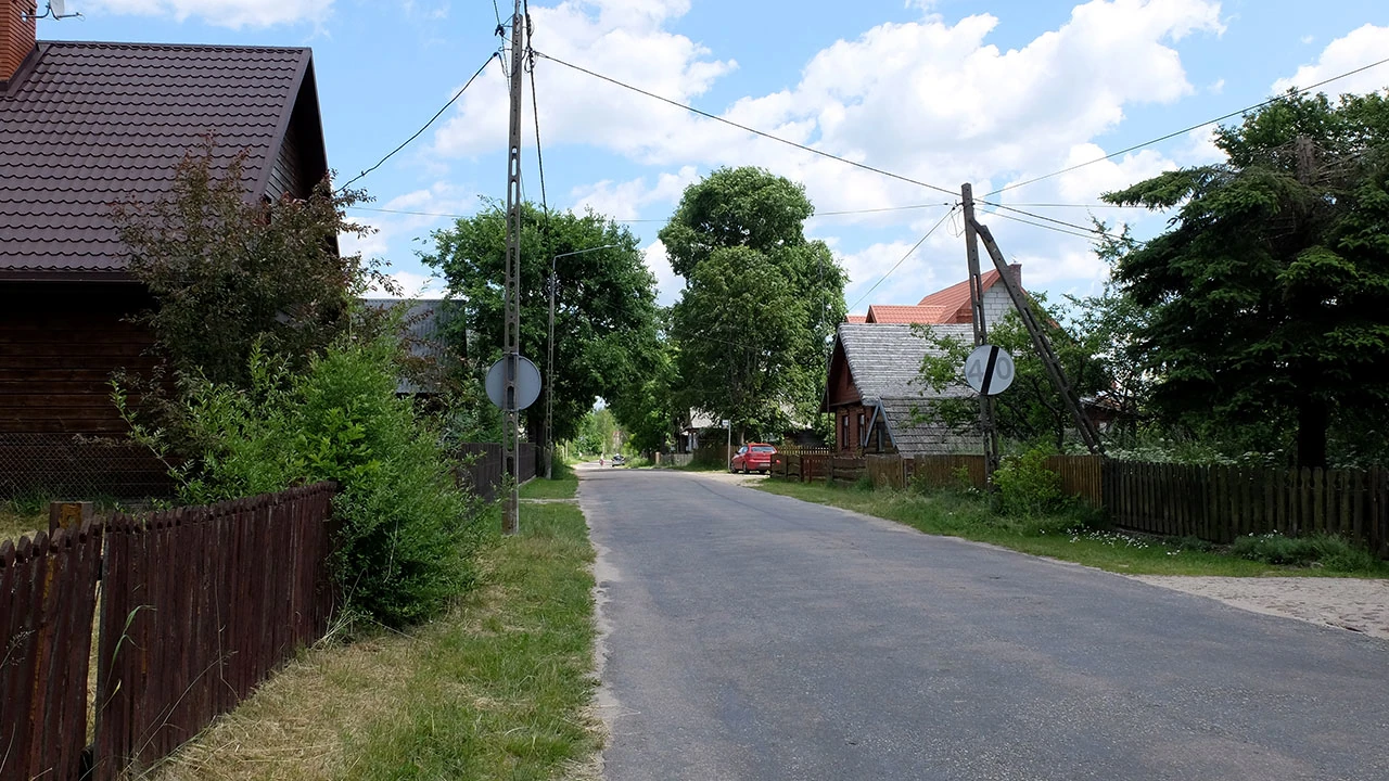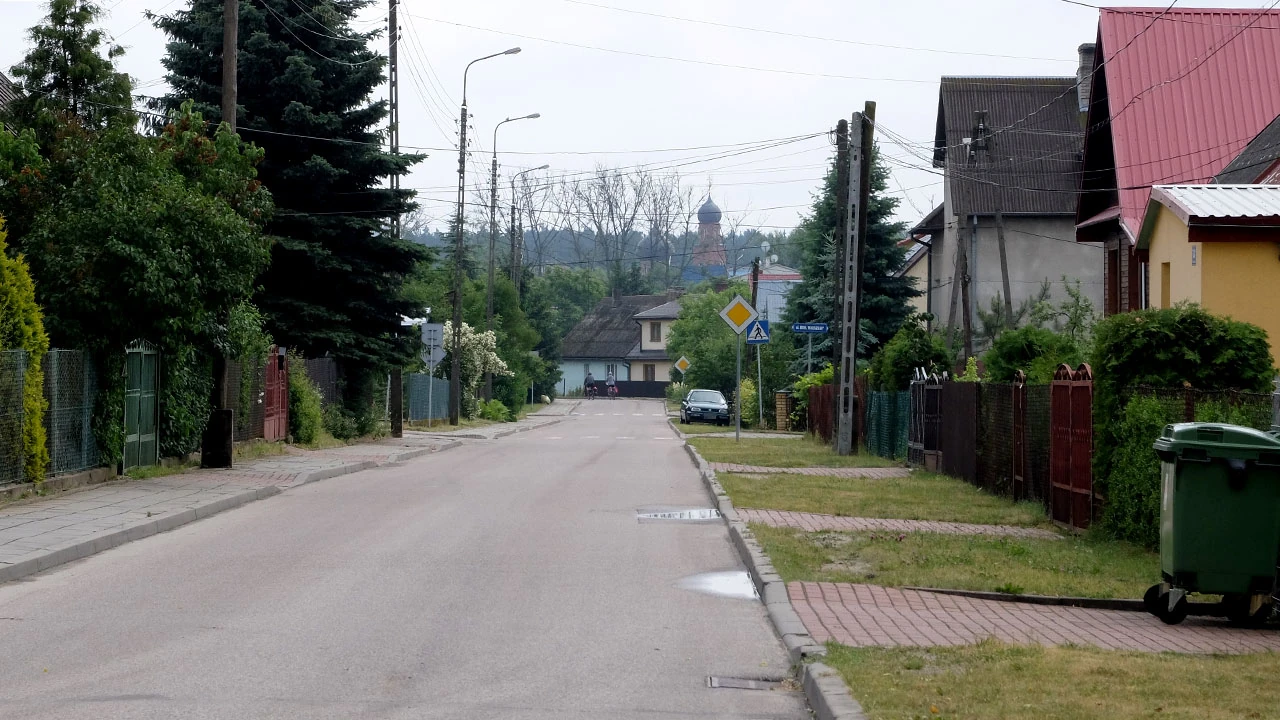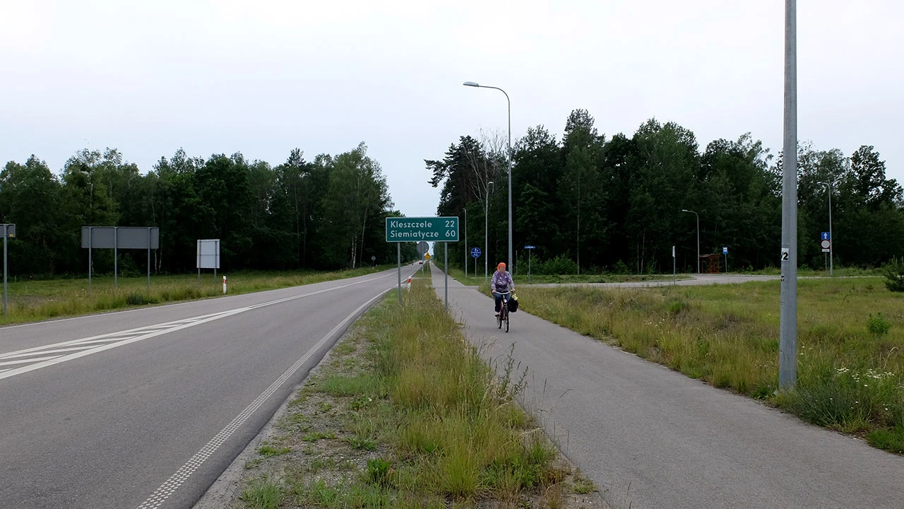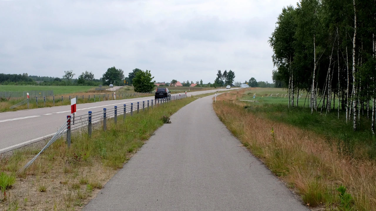 Chodzimy całkiem długo po parku, ale pora się ruszyć, bo plany mamy jeszcze całkiem bogate. Przez miejscowość Progale dojeżdżamy do ulicy Wrzosowej w Hajnówce i potem jedziemy wzdłuż drogi wojewódzkiej numer 685. A obok jezdni zbudowano bardzo przyzwoitą drogę dla rowerów. Jest trochę nudno tak jechać obok samochodów, za to jest wygodnie i bezpiecznie.