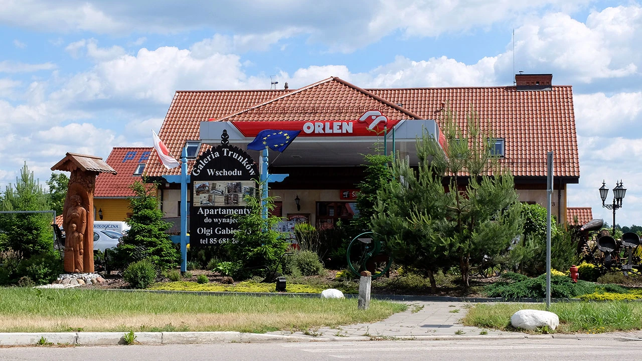 Przy wjeździe do Białowieży wita nas Orlen z ogromnym wyborem trunków – taki paliwowy sklep monopolowy. A potem co chwila jakieś żubry informują nas gdzie jesteśmy. Ciekawe czy mieszkańcy zauważają te sztuczne żubry?