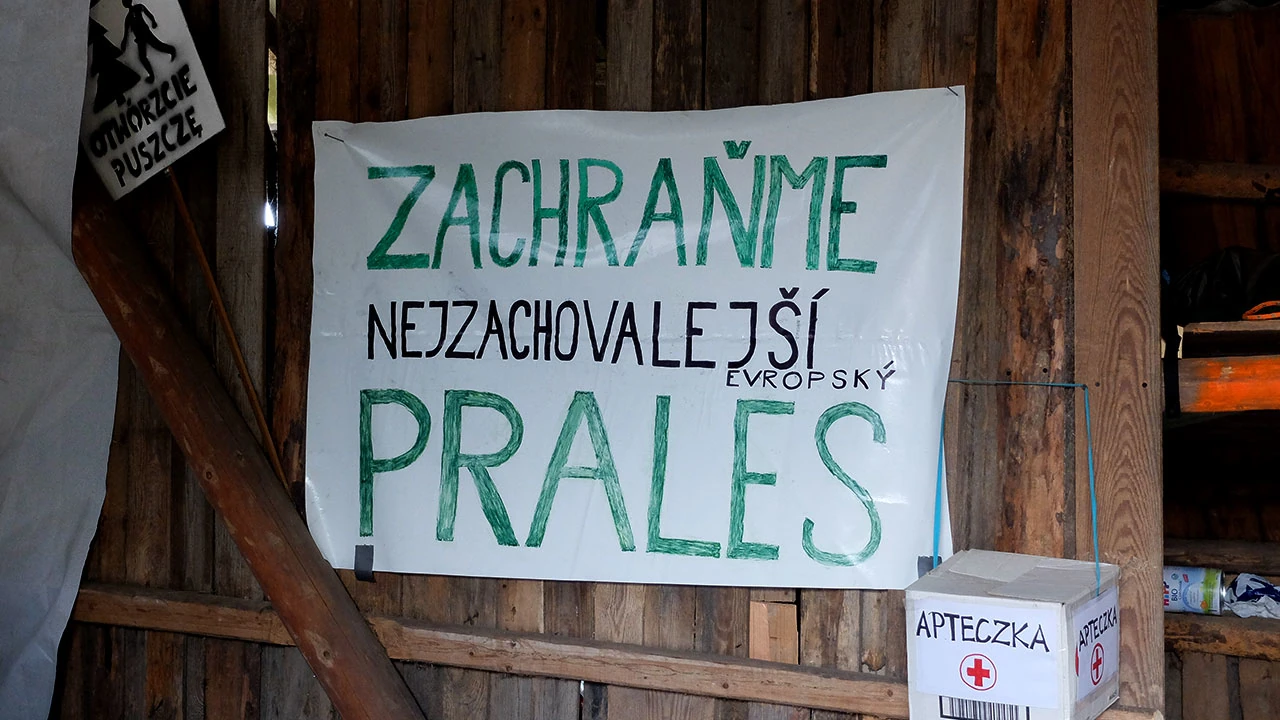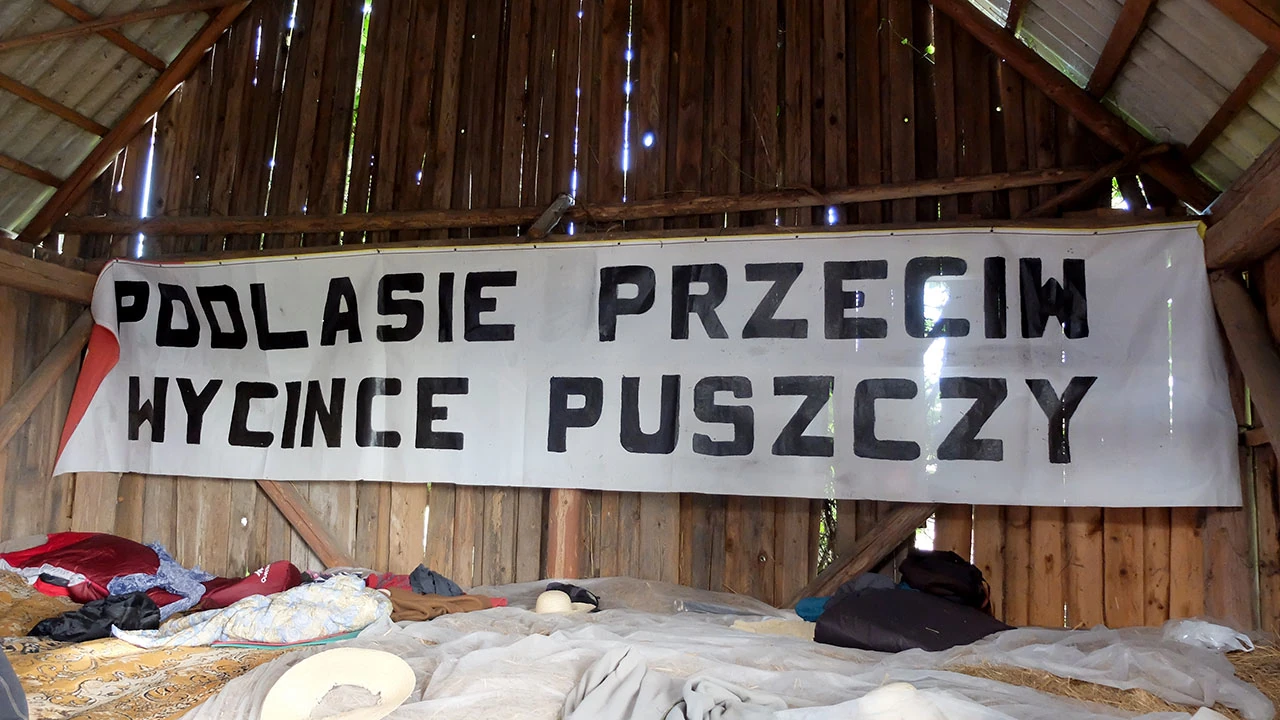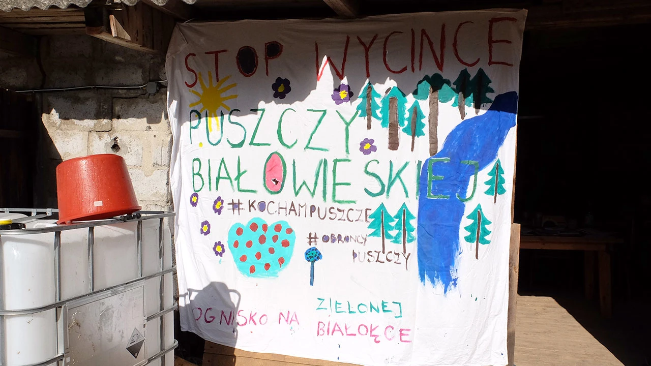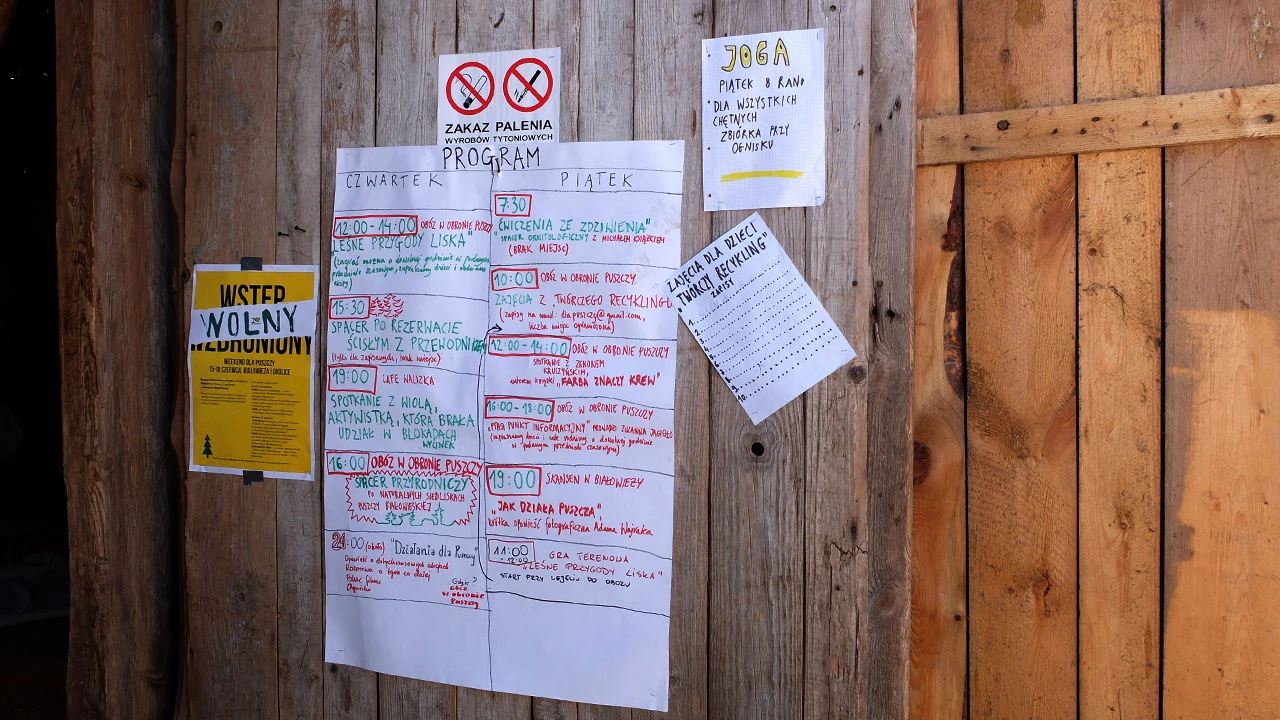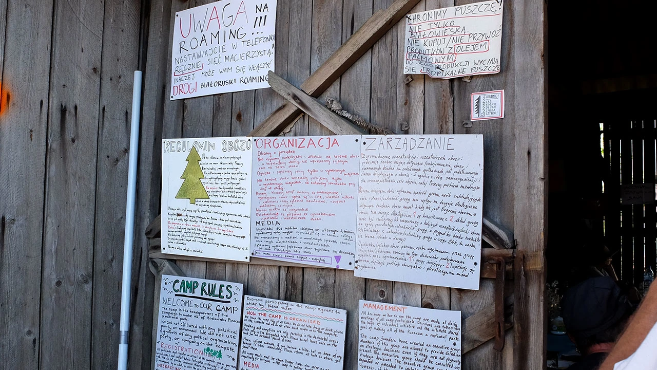 Odwiedzamy obóz, w który powstał by bronić puszczę przed wycinką drzew. Jest w nim trochę pustawo, bo większość osób wybrała się na spacer po lesie. Ale w sumie dzisiaj jest około 70 osób. Jesteśmy bardzo mile zaskoczeni, bo po obozie oprowadza nas chłopak, który tu mieszka.