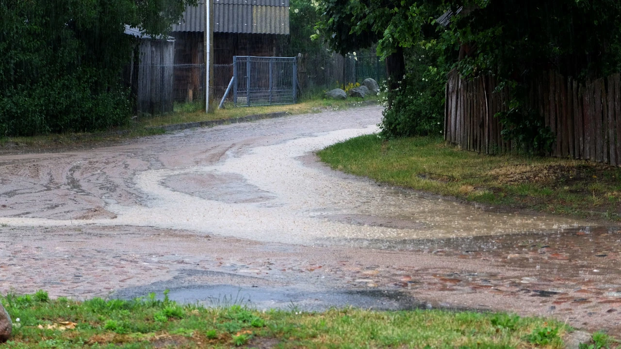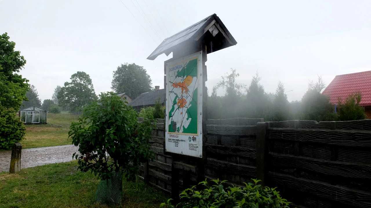Ściana wody leje się z nieba, a apogeum ulewy zatrzymuje nas w Dobrowodzie. Stoimy sobie pod daszkiem przystanku, choć równie dobrze moglibyśmy stać obok, patrzymy jak woda sunie uliczkami. Jest malowniczo i wodniście.