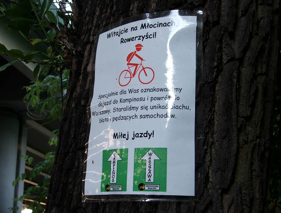 Z Grochowa, przez most Świętokrzyski przejeżdżamy na druga stronę Wisły i jedziemy w kierunku Młocin. Po drodze widzimy zachęcający plakat kierujący nas wprost do Kampinosu – jedziemy więc zgodnie ze znakami.