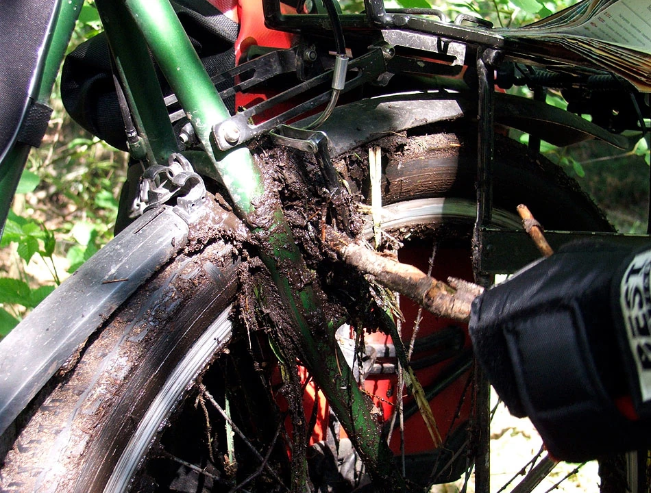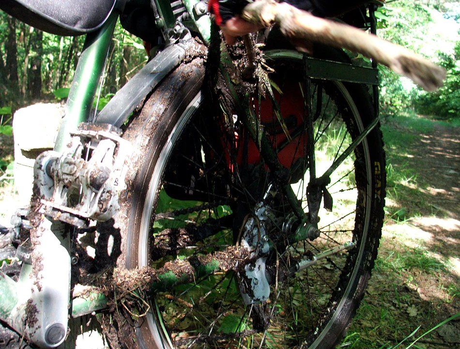 Jesteśmy brudni, pogryzieni i śmierdzimy błotem. Błoto i trawa powciskane są w zębatki i hamulce. Trochę czyścimy maszyny i ruszamy dalej.