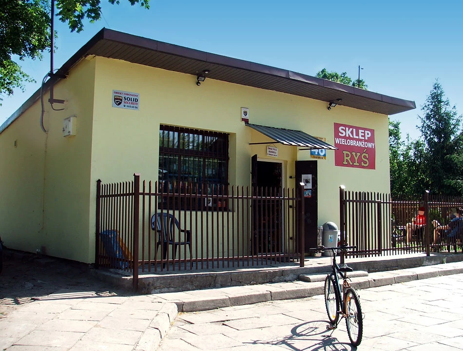 W sklepie w Sierakowie posilamy się nieco. Pod sklepem stoi zaparkowany Traper2 produkowany przez Romet w latach siedemdziesiątych.