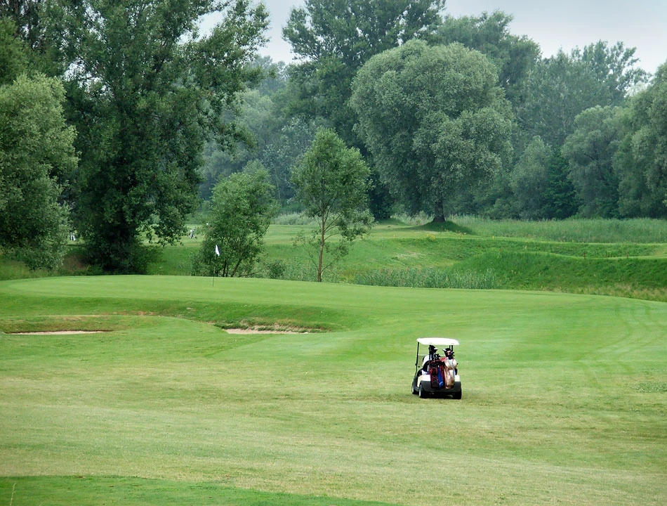 Na wysokości Rajszewa mijamy First Warsaw Golf & Country Club. Pole golfowe położone jest malowniczo w zakolu rzeki, a na swoim terenie ma kilka stawów — pewnie pozostałość starorzecza Wisły.