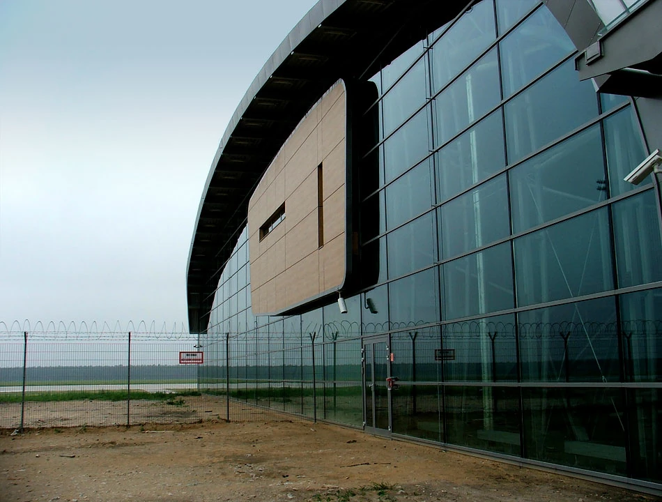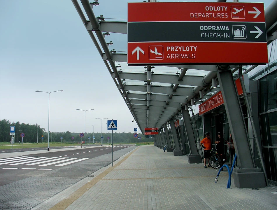 Budynek lotniska zaprojektowała pracownia APA Kuryłowicz i Associates. Stefan Kuryłowicz był zapalonym pilotem i projektując terminal lotniska inspirował się budową skrzydła samolotu. Budynek lotniska jest rzeczywiście prosty, nam przywodzi na myśl lotniczy hangar. Objeżdżamy lotnisko dookoła i drogą numer 62 kierujemy się w stronę miejscowości Mochty-Smok.