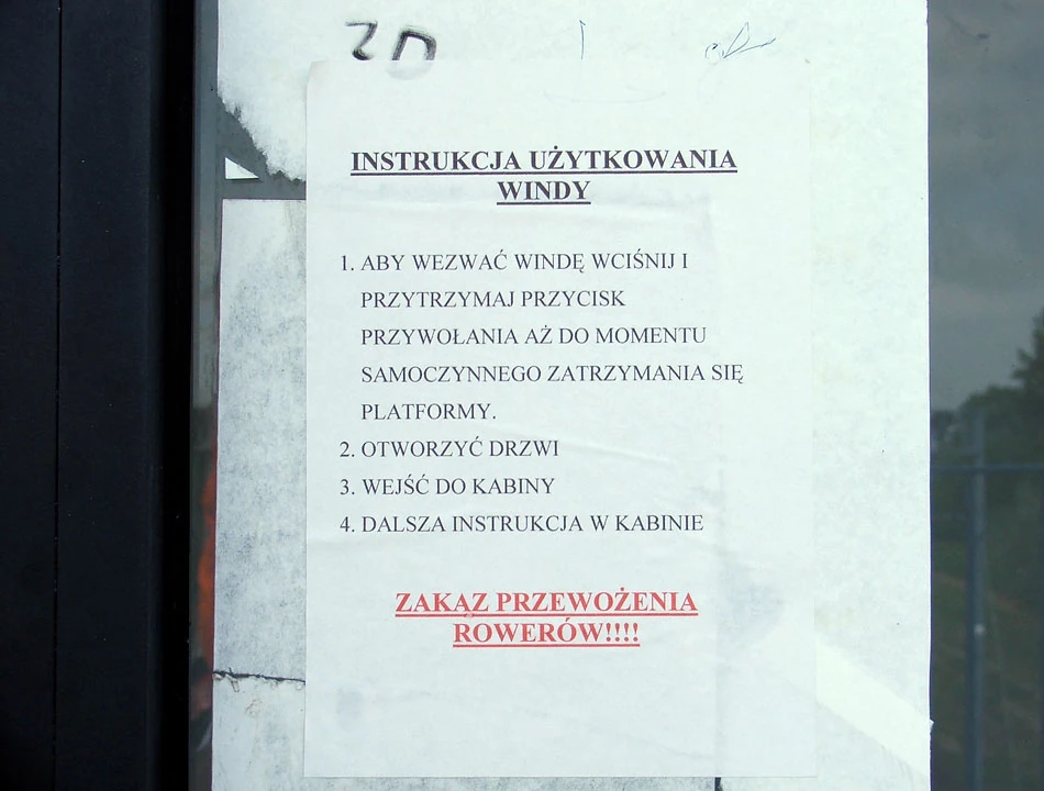 Wchodzimy do poczekalni z rowerami i na dzień dobry objeżdżają nas dzielni SOKiści: - gdzie się pchacie z tymi rowerami? Potem ciąg dalszy przyjemności. Na peronach są co prawda windy, ale instrukcja obsługi nie pozostawia złudzeń — rowery nosimy po schodach.