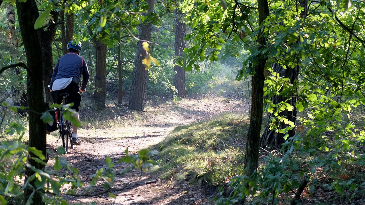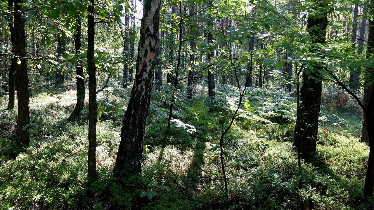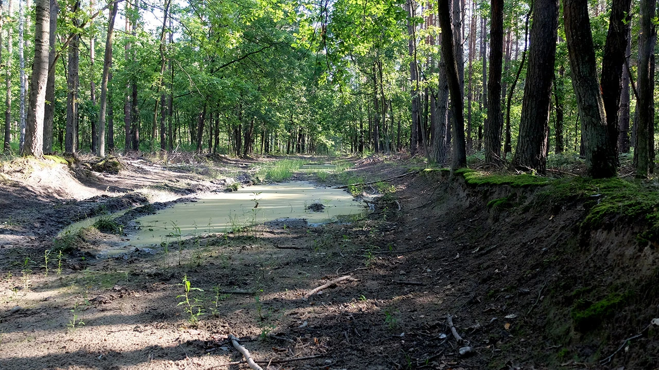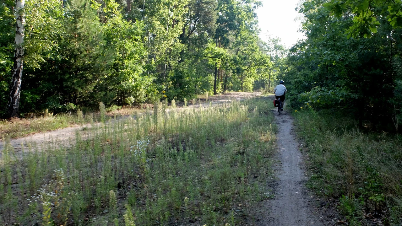 Potem, gdzieś za Działyńczyków w Rembertowie a przed granicą Wesołej, jedziemy przez malowniczy lasek. Przez drzewa prześwitują tory prowadzące na Mińsk Mazowiecki.