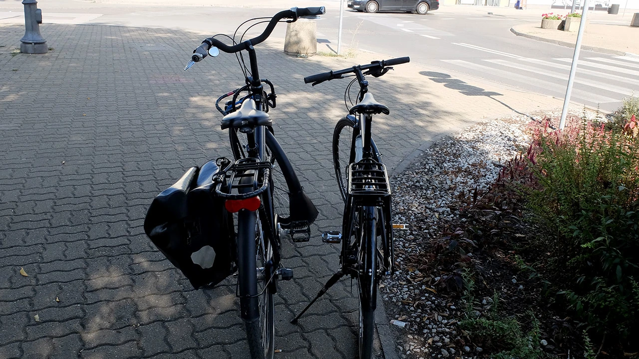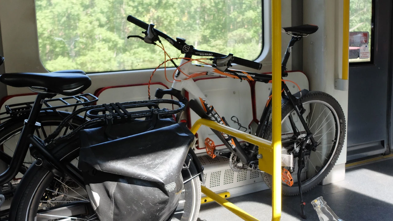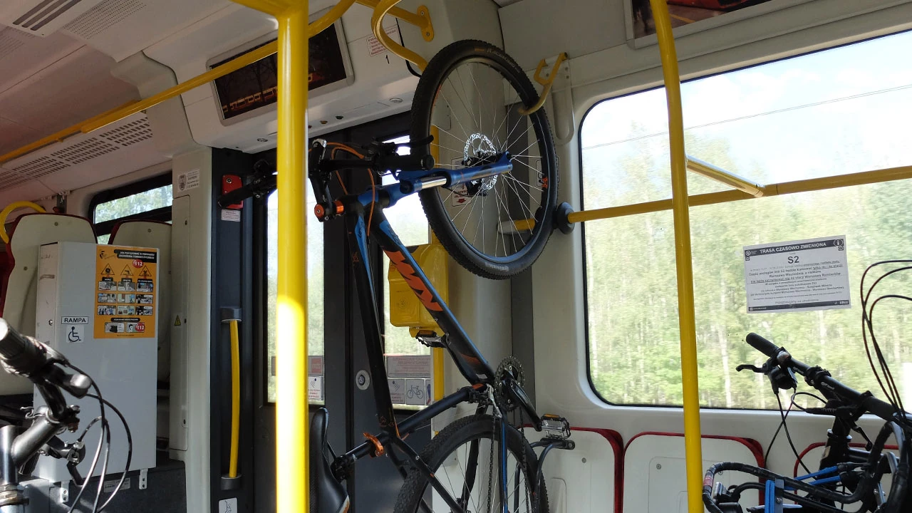 Wsiadamy w pociąg i opuszczamy bitewne tereny. A w wagonie wielbiciel wieszania roweru na haku. Spotykamy też nowatorskie rozwiązanie transportowe: rower osadzony okrakiem na poręczy.