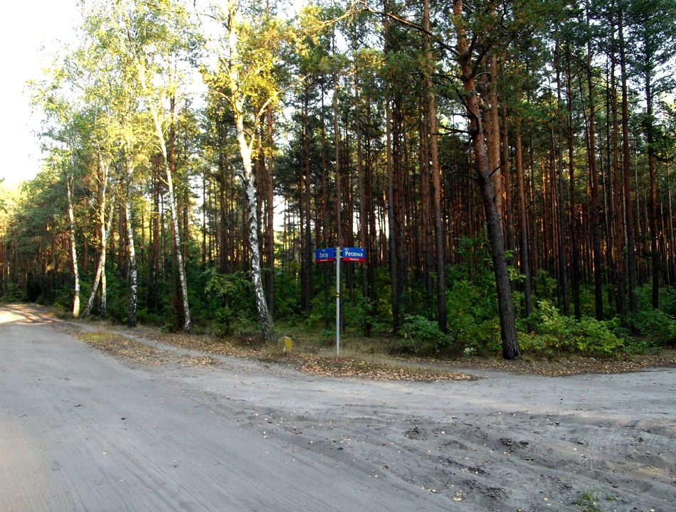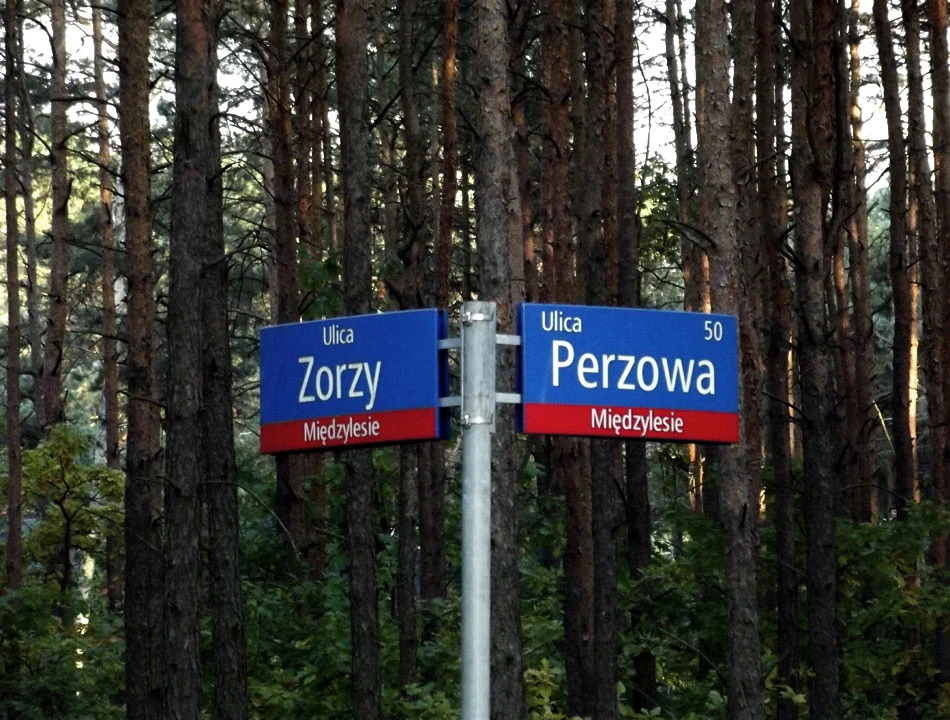 Skręcamy w Hafciarską, która płynnie przechodzi w Zorzy. Widać jak miasto się wycofuje. Najpierw jedziemy szeroką ulicą, potem jej miejsce zajmuje droga z kostki biegnąca między jednorodzinnymi domami. Wreszcie znajdujemy się w lesie, a o tym, że to ulica przypominają tabliczki wiszące nad piaszczystą ścieżką.