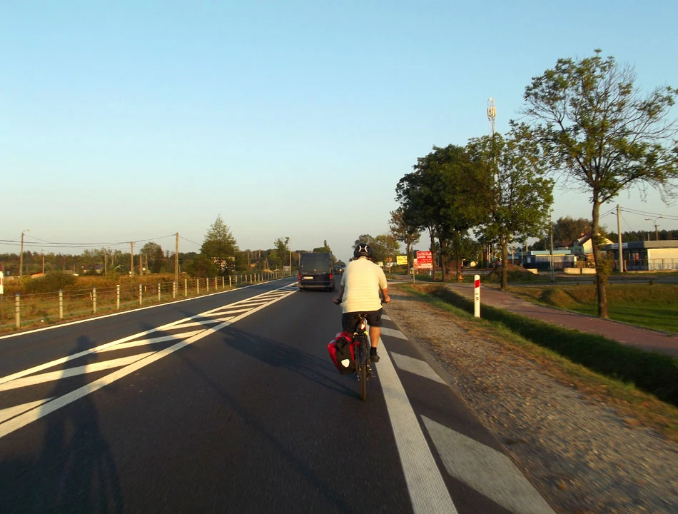 Na wysokości miejscowości Dębe Wielkie daje się zjechać na lokalną drogę, równoległą do E30. Jest spokojniej i mniej nerwowo. Powoli się zmierzcha, słońce barwi świat na miedziany kolor.