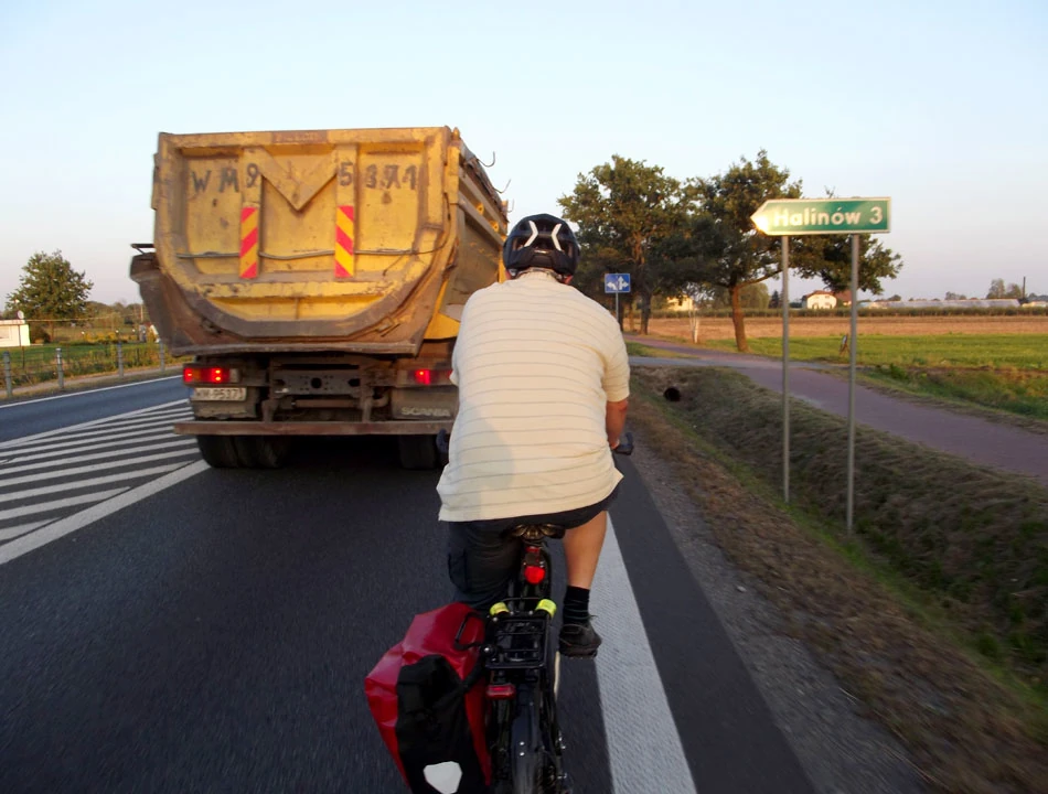 Przez Starą Miłosną i Wesołą jedziemy Gościńcem. Ruch niewielki mimo czwartkowego popołudnia. Z Gościńca wjeżdżamy na drogę międzynarodową E30 do Terespola. Tu jest dziki tłum samochodów. Mimo to rezygnujemy z drogi biegnącej wzdłuż arterii – jest z kostki i nie wiadomo czy to chodnik, czy droga dla rowerów. Wybieramy szosę. Na szczęście jest tu dość szerokie pobocze. Na drodze tworzą się korki i często poruszamy się szybciej niż samochody. Nic nas nie zachęca do rozglądania się na boki; głowa w dół i jak szybko się da, ruszamy w stronę Mińska Mazowieckiego.