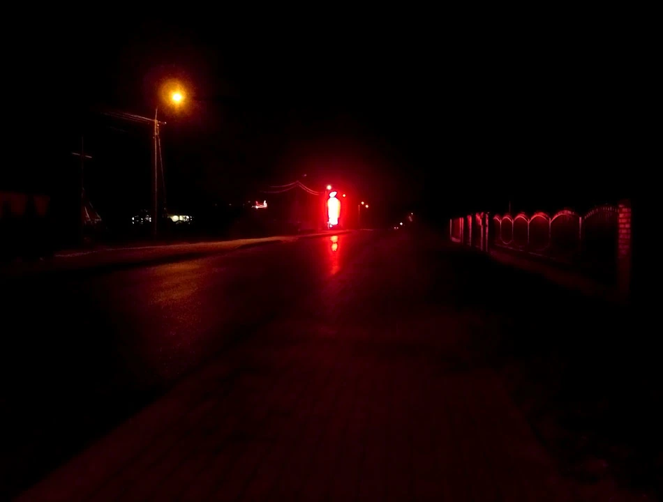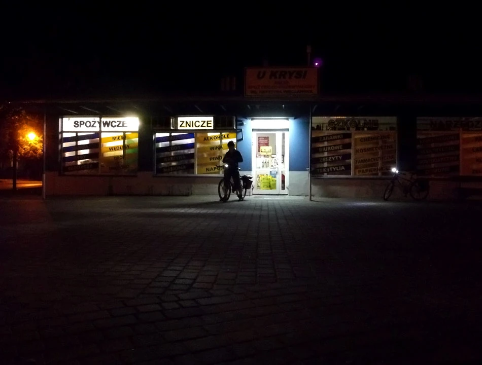 Jedziemy drogą 802 w stronę Pogorzeli. Ciemno, choć oko wykol. Co prawda niebo jest pięknie rozgwieżdżone, ale księżyca nie ma ani kawałeczka. W Pogorzeli Marcin robi zdjęcie jedynego jasnego punktu – stacji benzynowej. Jednak nie możemy narzekać. Co prawda jest ciemno, ale wszystkie mijane wsie są oświetlone i w terenie zabudowanym jedzie się dość łatwo.