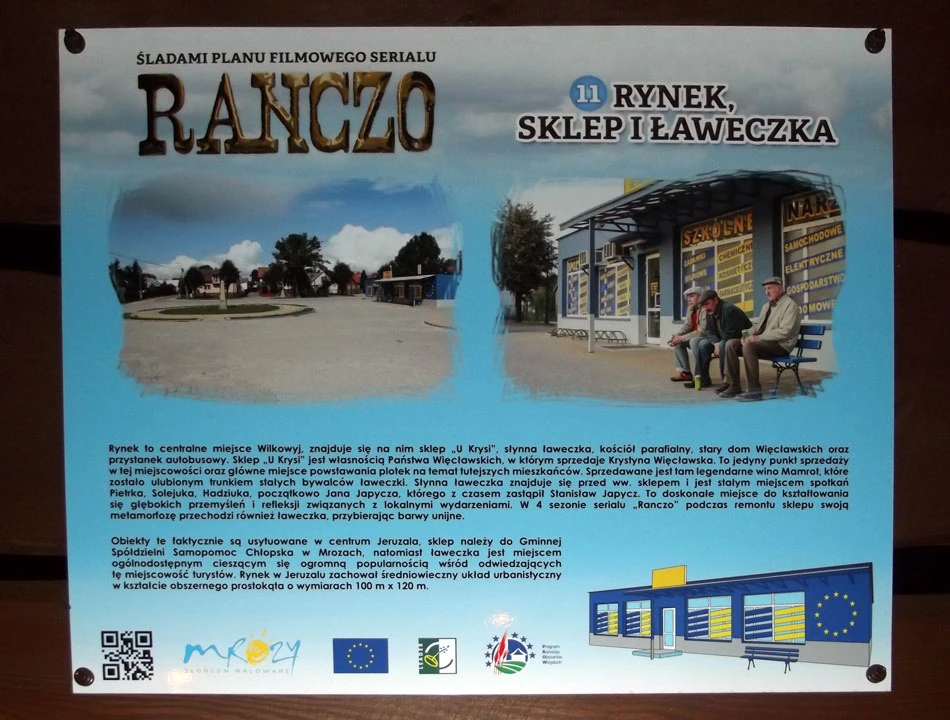 Podjeżdżamy bliżej, jest i słynny sklep, choć ławeczka chyba inna niż w serialu. Spóźniliśmy się kilka minut — jest po dziewiątej i sklep już nie działa. Nie wzniesiemy w domu toastu słynnym Mamrotem z Wilkowyj.
