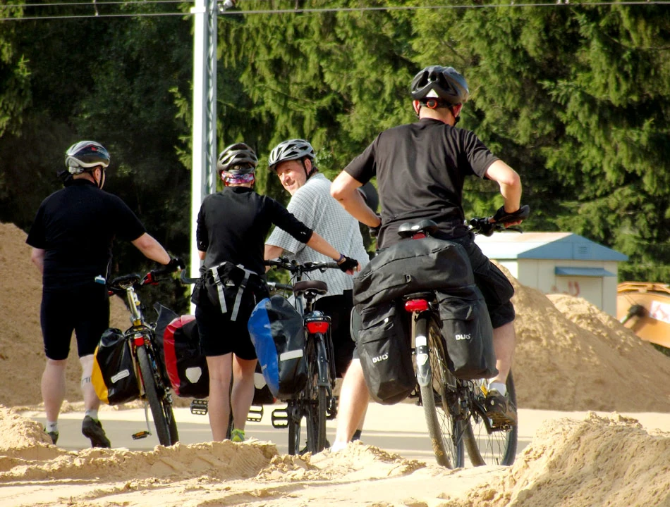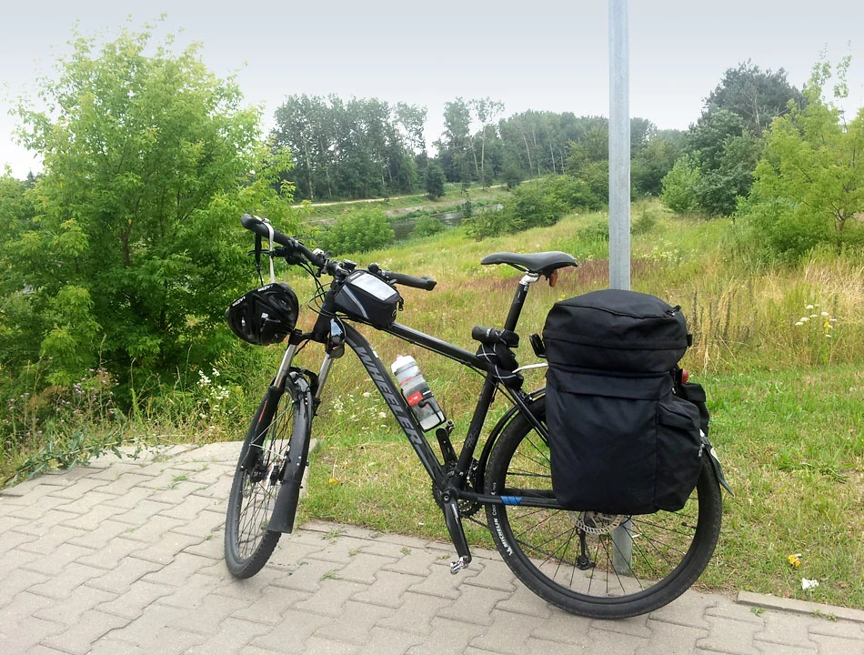 Jesteśmy wyekwipowani, jak przystało na porządną wyprawę. Sakwy z zapasowymi ubraniami, prowiantem. Każde z nas stosuje trochę inną taktykę. Niektórzy mają kanapki i zapasy płynów, inni planują zapasy uzupełniać podczas podróży. Marek ma jeszcze dodatkowo zamontowany na ramie futerał na telefon i przenośny akumulator do ładowania telefonu.