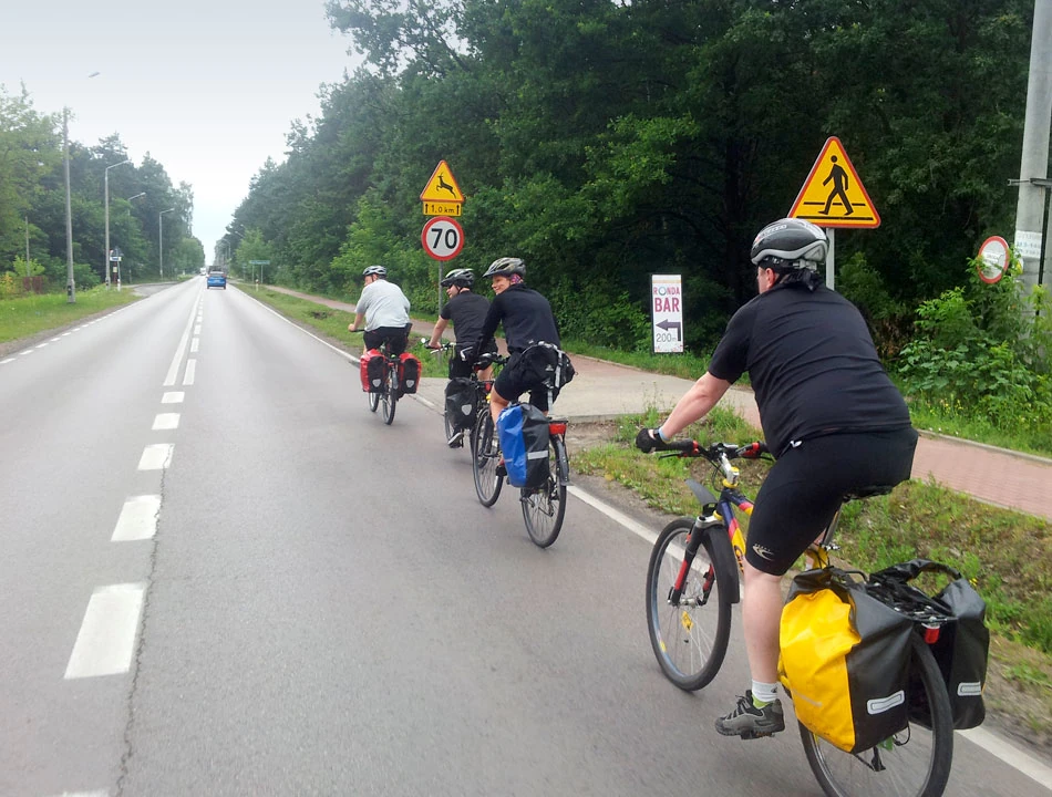 Zbliżamy się do Susza. Droga poprawia się, pojawiają się też samochody. Zaczyna padać. I robi się coraz mniej przyjemnie. Spośród nas w najlepszej formie jest Marek. Przejechane kilometry jakby nie robiły na nim wrażenia. Wjeżdżamy do Prabut i znowu odpoczynek na stacji benzynowej. Agnieszka i Kowlak nie mają siły dalej jechać. Bardzo potrzebują snu. Jednak nie udaje nam się znaleźć w okolicy żadnej miejscówki do spania. Obsługa stacji też nic nie wie o możliwościach nocowania w Prabutach. Agnieszka i Kowlak decydują się na podróż pociągiem do Malborka i łapanie stamtąd pociągu do Warszawy. Kowlak ma na liczniku 259 kilometrów; oboje z Agnieszką poprawili swoje „życiówki”. Z żalem rozstajemy się z częścią drużyny, robimy sobie pożegnalne zdjęcie i w trzyosobowym składzie ruszamy w stronę Malborka.