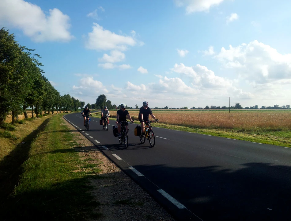 Omijamy większe drogi, jedziemy wzdłuż Wisły, by potem odbić na Koźliny i Suchy Dąb; potem jedziemy przez Wróblewo. Obok płynie rzeczka, która okazuje się być Motławą — tą samą, nad którą tłumy turystów spacerują w Gdańsku. Marek łapie gumę; szybka naprawa i dalej w drogę.