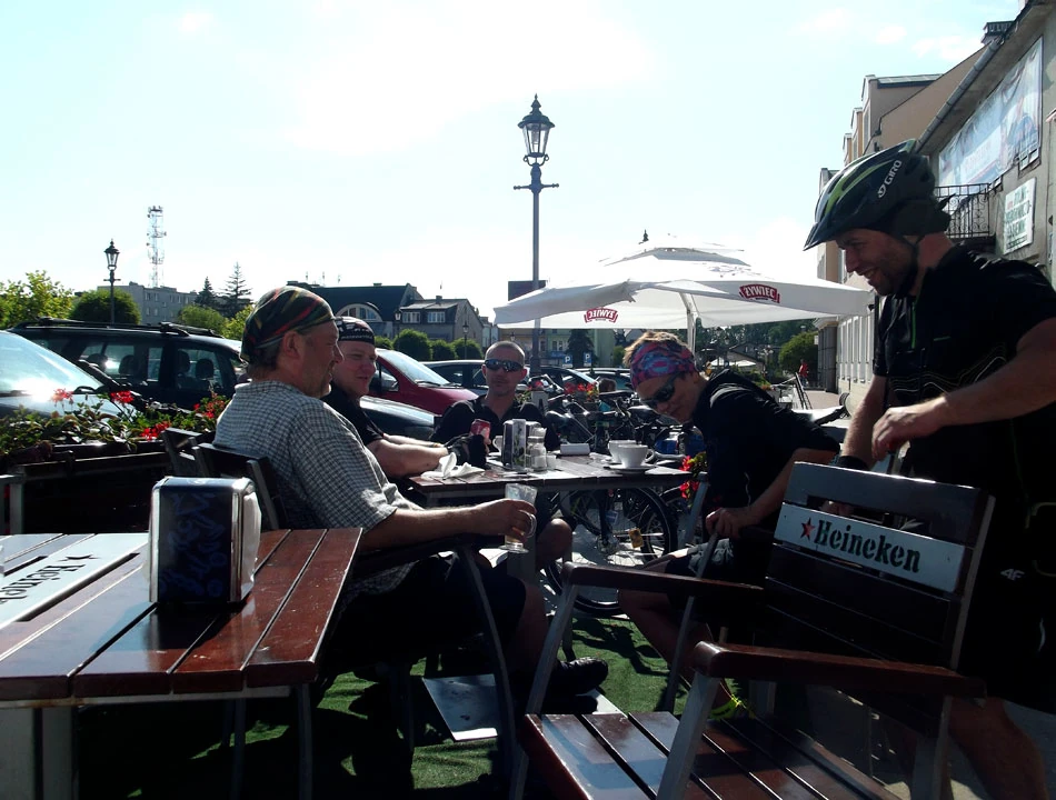 Na rynku w Ciechanowie (pl. Jana Pawła II) robimy sobie postój. Wszak zgodnie z naszymi ustaleniami wypada nam tu dłuższy odpoczynek. Humory mamy dobre – awaria została usunięta. Pogoda wyraźnie się poprawiła. Do tej pory chmurne niebo wypogodziło się, świeci piękne słońce, nawet opalamy się trochę. Jest kawa z ekspresu i atmosfera robi się całkiem wakacyjna.