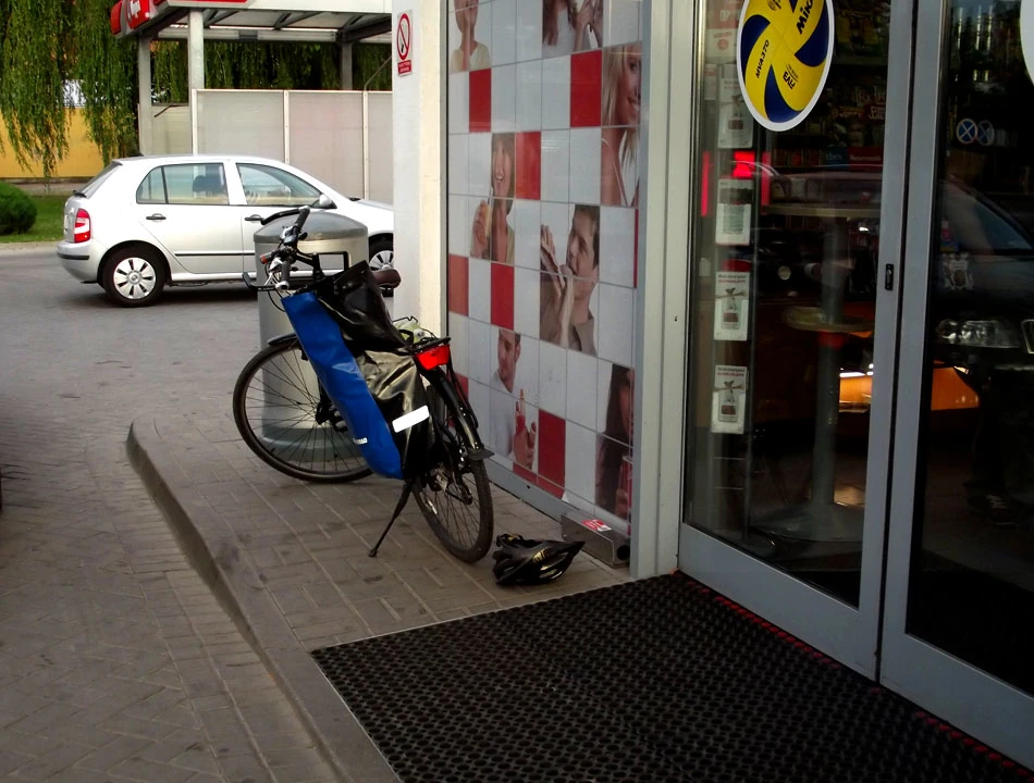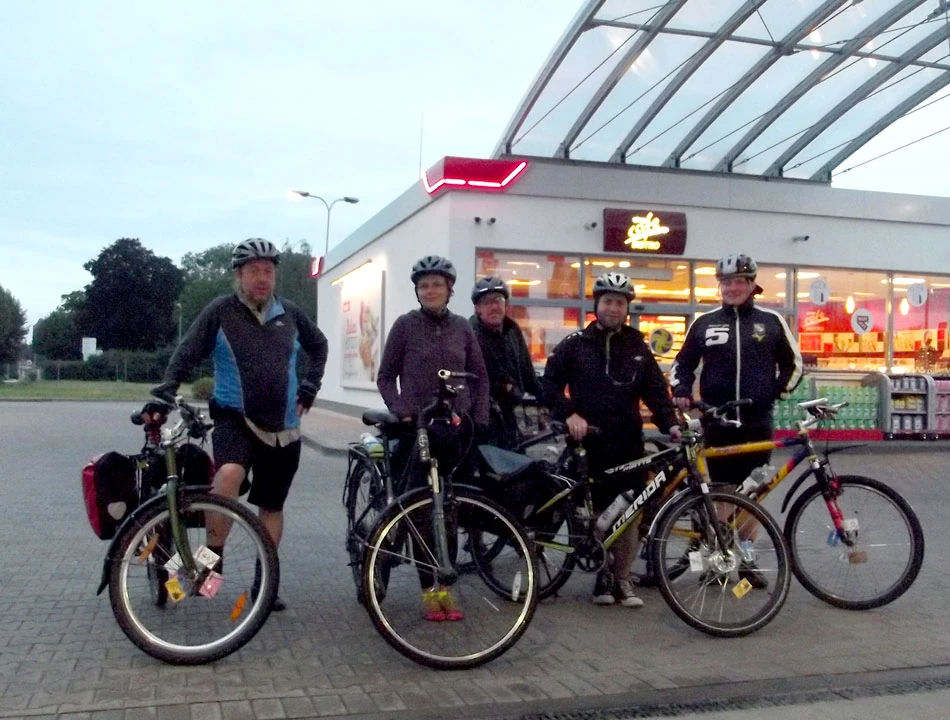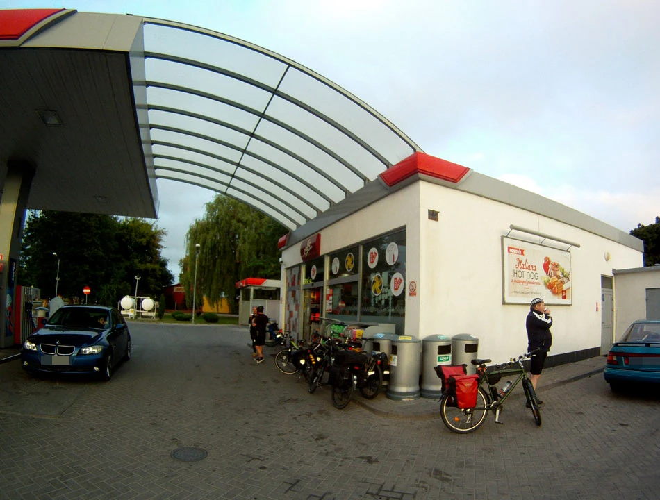 Przed Działdowem mija nas BMW na niemieckich numerach. Z okien wysuwają się ręce z podniesionymi kciukami i słyszymy słowa zachęty do dalszej jazdy. Bardzo to miłe, bo na ogół kierowcy trąbią na nas raczej mało przyjaźnie. W Działdowie robimy kolejny postój. I tym razem zatrzymujemy się na stacji benzynowej. To zabawne, że te samochodowe przybytki są wsparciem dla nas, rowerkowców. Na stacji spotykamy BMW, z którego machano nam po drodze. Okazuje się, że samochodem zainteresowała się policja. Jak dało się usłyszeć z rozmów policjantów i kierowcy, młoda załoga BMW porusza się samochodem na rejestracji innej niż w dowodzie rejestracyjnym. Ciekawi jesteśmy, jak skończy się ta przygoda. Kończy się mandatem, zatrzymaniem dowodu rejestracyjnego i puszczeniem wolno inkryminowanego BMW. Powoli się zmierzcha. Jesteśmy mniej więcej w połowie planowanej trasy, około 150. kilometra. Mamy małe opóźnienie w stosunku do planowanego czasu wyprawy.