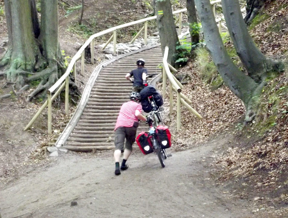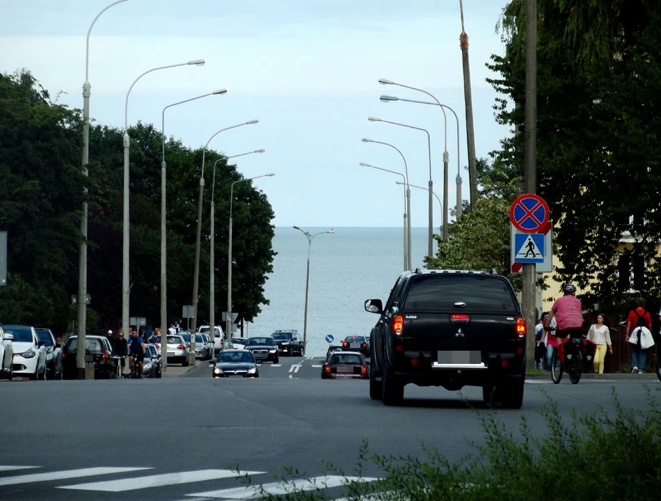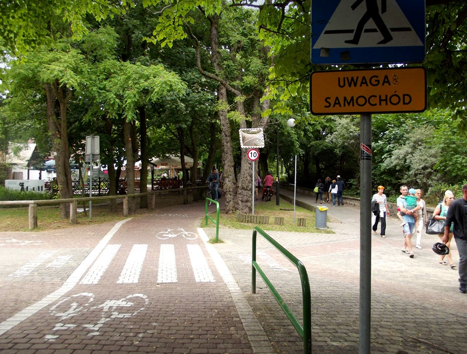 Wzdłuż wybrzeża jedziemy w stronę Sopotu. Droga jest elegancka, asfaltowa, zachęcająca tłumy rowerzystów do przemieszczania się. Im bliżej Sopotu, tym gorsza droga. Nawierzchnia słabsza, znika infrastruktura, oznakowań coraz mniej. Jest za to sławne w całej Polsce ograniczenie prędkości rowerów do 10 kilometrów na godzinę. Aż wreszcie droga niespodziewanie kończy się na plaży. A my po schodach wpychamy rowery na klif, na szczęście obok stopni są rynny.