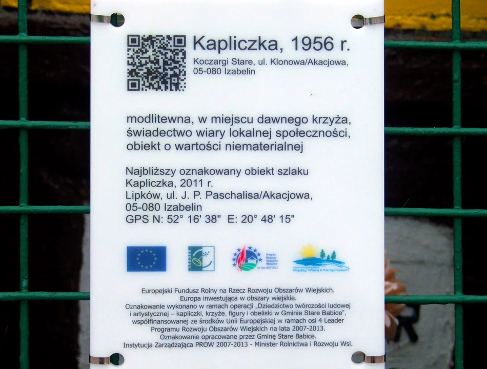 W Koczargach, na rogu Akacjowej i Klonowej, stoi kapliczka. W zasadzie zwyczajna, ale chyba pierwszy raz widzimy na kapliczce fotokod. A kod prowadzi do projektu wspieranego przez ciocię Unię i pokazuje wiele ciekawych miejsc w okolicy.