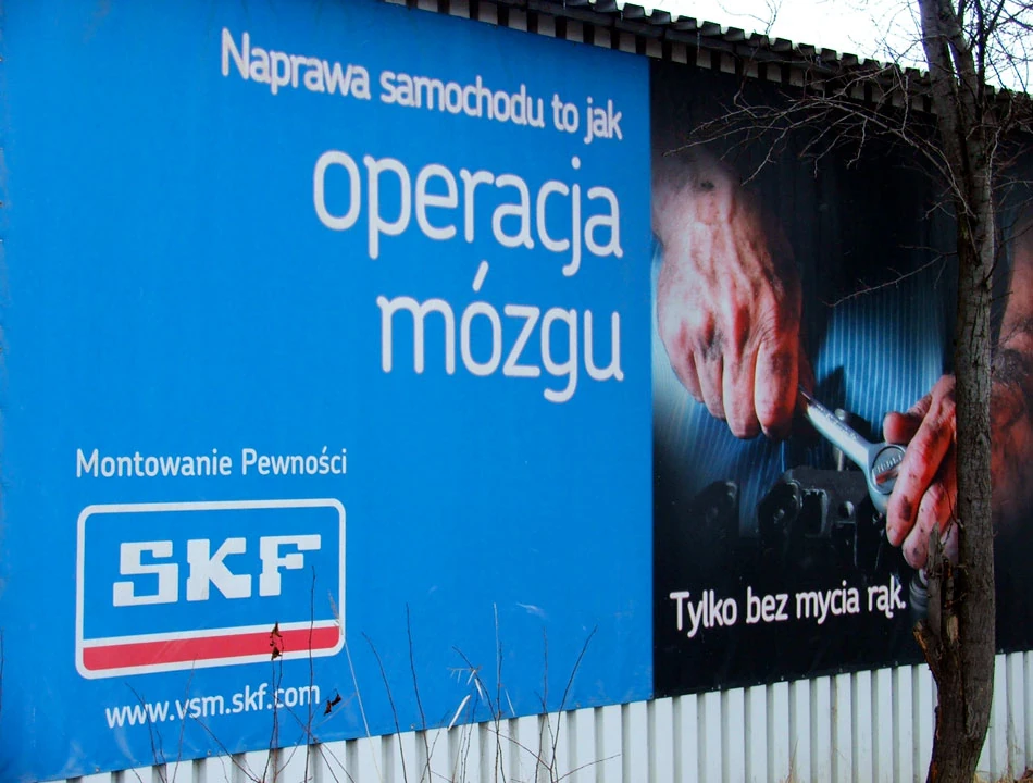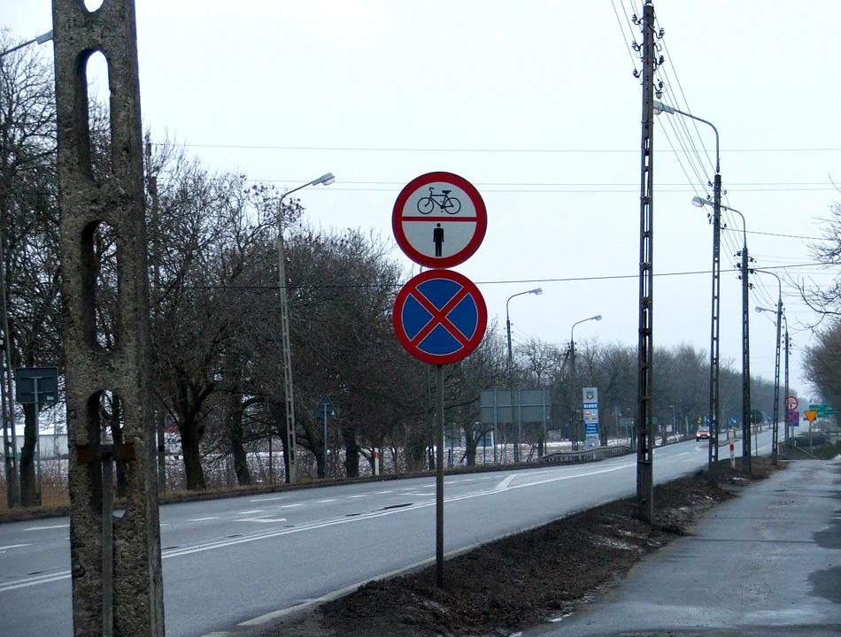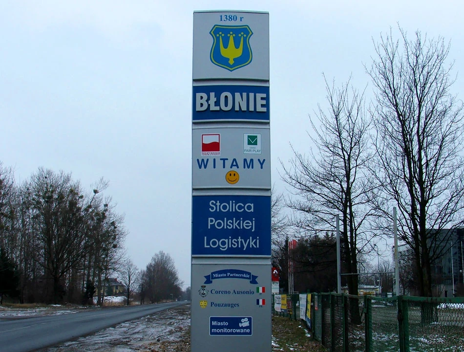 Błonie wita cud tablicą, ciekawą reklamą łożysk i zakazem ruchu rowerów.