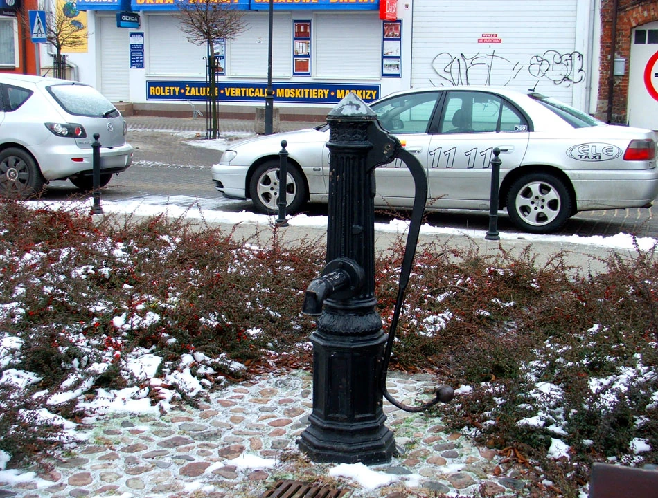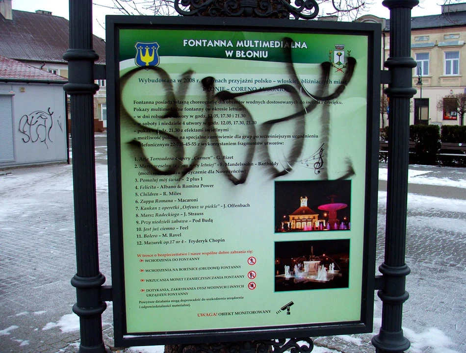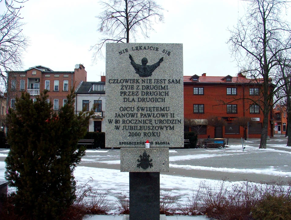 A potem wjeżdżamy na rynek. Błonie o tej porze smutne jakieś, szare i puste. Trochę ludzi kręci się koło Centrum Kultury, ale chyba tylko z powodu imprezy dla dzieci. A tak, wkoło pustka. Rynek, choć duży i ze sporym ratuszem, to także z biedną fontanną i zabazgranymi tablicami informacyjnymi.