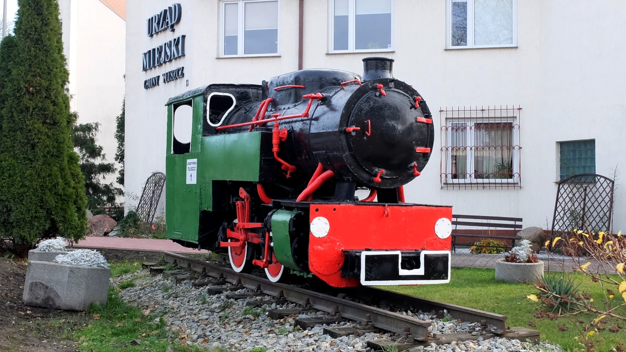 Przed Urzędem Miejskim stoi parowozik. Może to pamiątka po kolejce wąskotorowej łączącej hutę szkła w Tłuszczu z terenami kolejowymi?