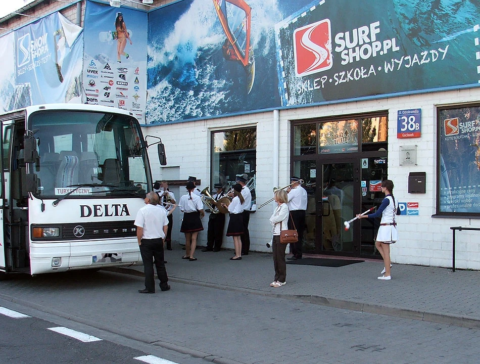 Meandrując niespiesznie po Grochowie, dojeżdżamy w okolice zajezdni Ostrobramska i słyszymy muzykę. Jest 6:30, my jeszcze niezbyt obudzeni, ale żeby słyszeć głosy, to lekka przesada. Na chodniku, w luźnym szyku, stoi sobie orkiestra dęta i gra. Tamburmajorka maszeruje w miejscu i macha buławą, a orkiestra z OSP Pułtusk wyraźnie ćwiczy przed występem. Być może ma przygrywać pielgrzymce wychodzącej do Częstochowy.