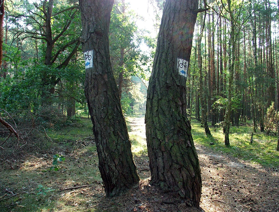 Jadąc przez Mazowiecki Park Krajobrazowy, natrafiamy na niebieski szlak rowerowy, dowcipnie wskazujący nam drogę.