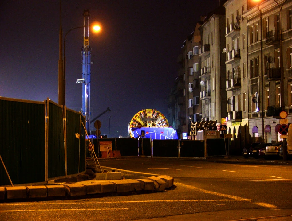 Przyzwyczailiśmy się już, że o poranku jest noc, a powietrze jest rześkie. Ruszamy w stronę Ronda Starzyńskiego. Najpierw jednak jedziemy na Targową, by w pobliżu Białostockiej zobaczyć tarczę, która za chwilę będzie drążyć tunel metra po praskiej stronie. Urządzenie rzeczywiście potężne, jednak trochę o wyglądzie zabawki dla dużych chłopców.