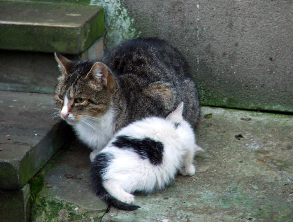 Ale jest też miły akcent. Kociątko — ostatnie pozostałe z miotu — pożywia się mlekiem matki.