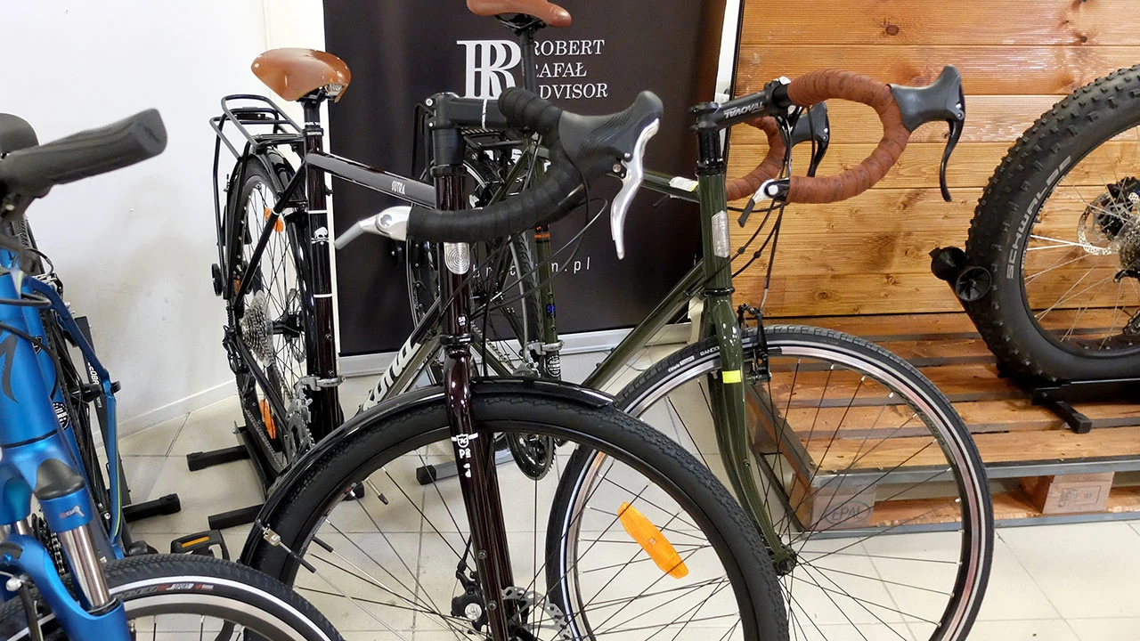 Naszą uwagę przyciągnął trekingowy zielony Fuji Touring. Rower stylizowany na stary, z ciekawie umieszczonymi manetkami zmiany biegów i z zapasowymi szprychami w komplecie. Cena całkiem miła, bo około 3500 złotych.