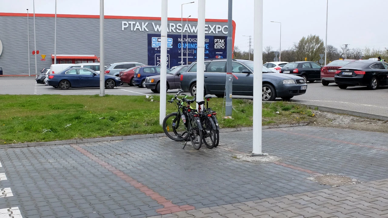 Wokół hal nie występuje żadna infrastruktura rowerowa, a bajki parkowane są, gdzie popadnie. My przypinamy się do masztu. Znajdujemy wejście i rejestrujemy się, dostajemy opaski na nadgarstki i możemy wejść.