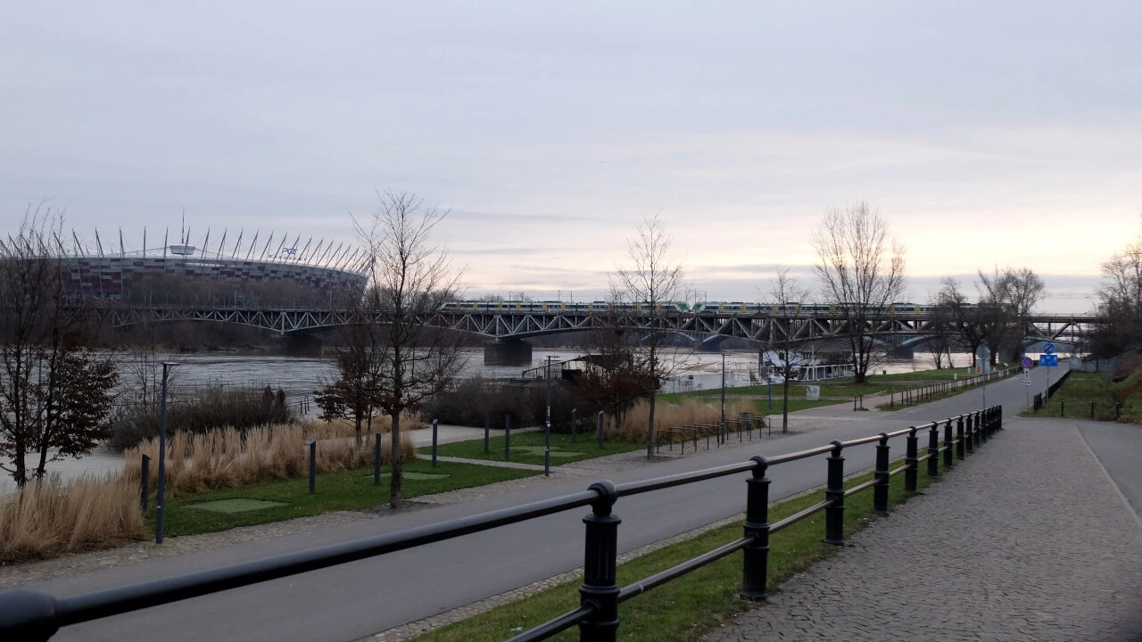 Zjeżdżamy nad rzekę. Gapimy się na przęsła nowego mostu – pierwszego pieszo-rowerowego w Warszawie. Sporo jest narzekań na to, że pieniądze wydane na most mogłyby lepiej posłużyć infrastrukturze rowerowej. Nam podoba się pomysł rowerowego połączenia brzegów Wisły. Praga będzie miała bliżej na Żoliborz.