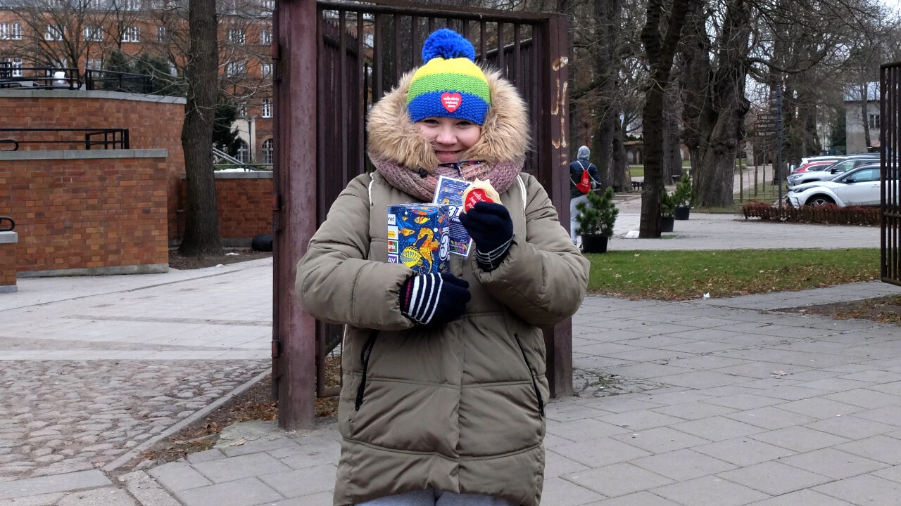 A tam pod kościołem miła pani kwestuje w imieniu Orkiestry. Ma elegancką czapkę z serduszkiem i uśmiech; kwestuje w tym samym miejscu od 16 lat, od momentu, gdy została mamą.