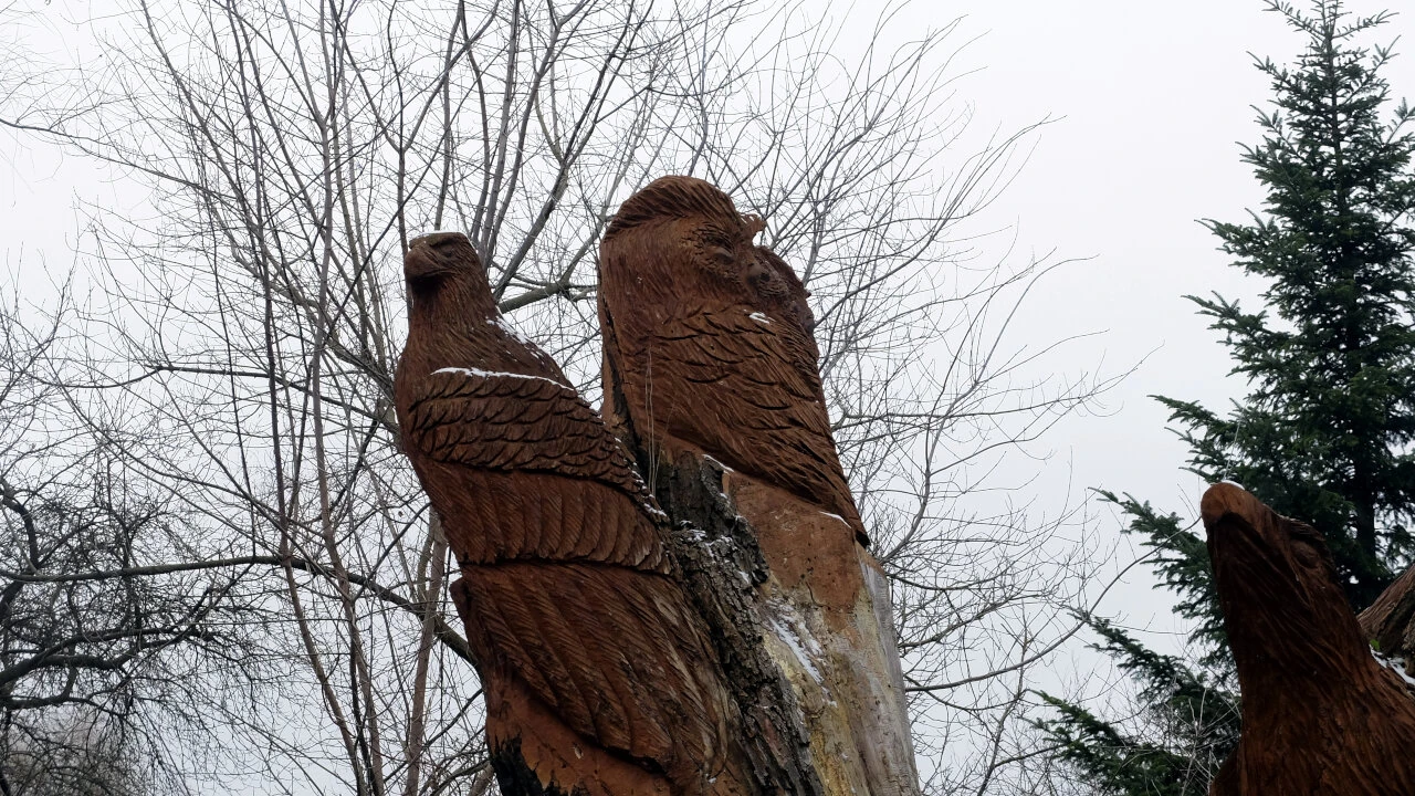 A tam rzeźby jakieś uczynione z pni drzew. O tyle dziwne, że pnie nadal tkwią w ziemi – hm.