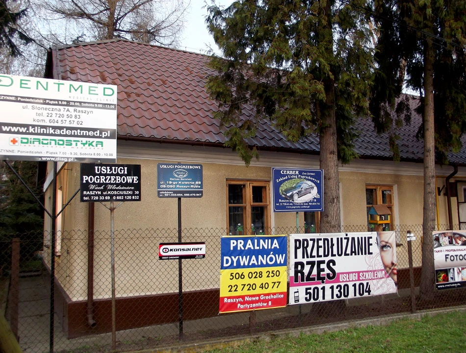 Żeby jednak nie było tak cudownie, zabytkowe budynki są raczej w mizernym stanie. A poza tym w centrum Raszyna króluje baner. I on do reszty szpeci okolicę.